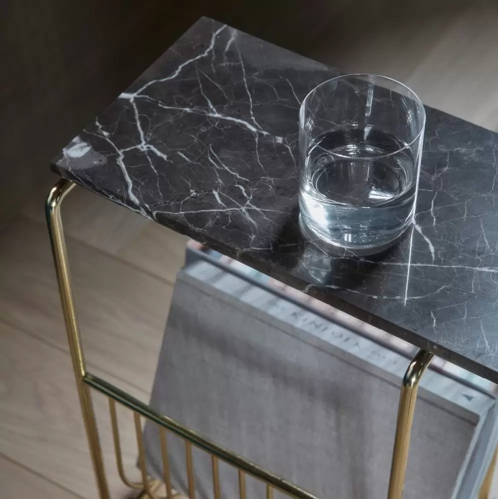 Dostępne warianty stolika; czarna podstawa/czarny marmur oraz złota podstawa/brązowy marmur.