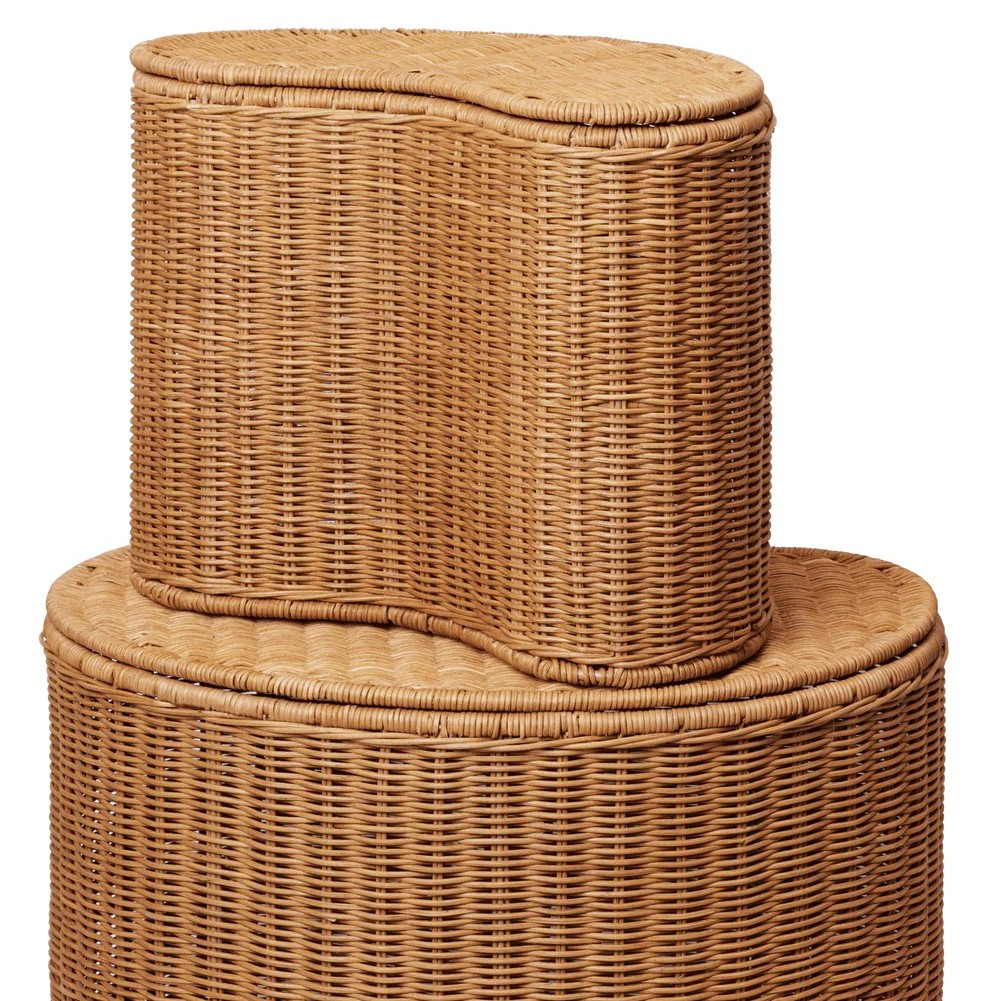 Zestaw koszy Willora duńskiej marki Ferm Living to połączenie naturalnego uroku rattanu z funkcjonalnością codziennego przechowywania. Każdy z koszy został ręcznie pleciony z rattanu i wzmocniony stalową konstrukcją, co zapewnia trwałość i stabilność. Ich organiczny kształt oraz ciepły, naturalny odcień wprowadzają do wnętrza przytulność i subtelny, skandynawski charakter. Większy kosz idealnie pomieści zabawki, książki czy tekstylia, a mniejszy sprawdzi się na drobiazgi lub akcesoria.