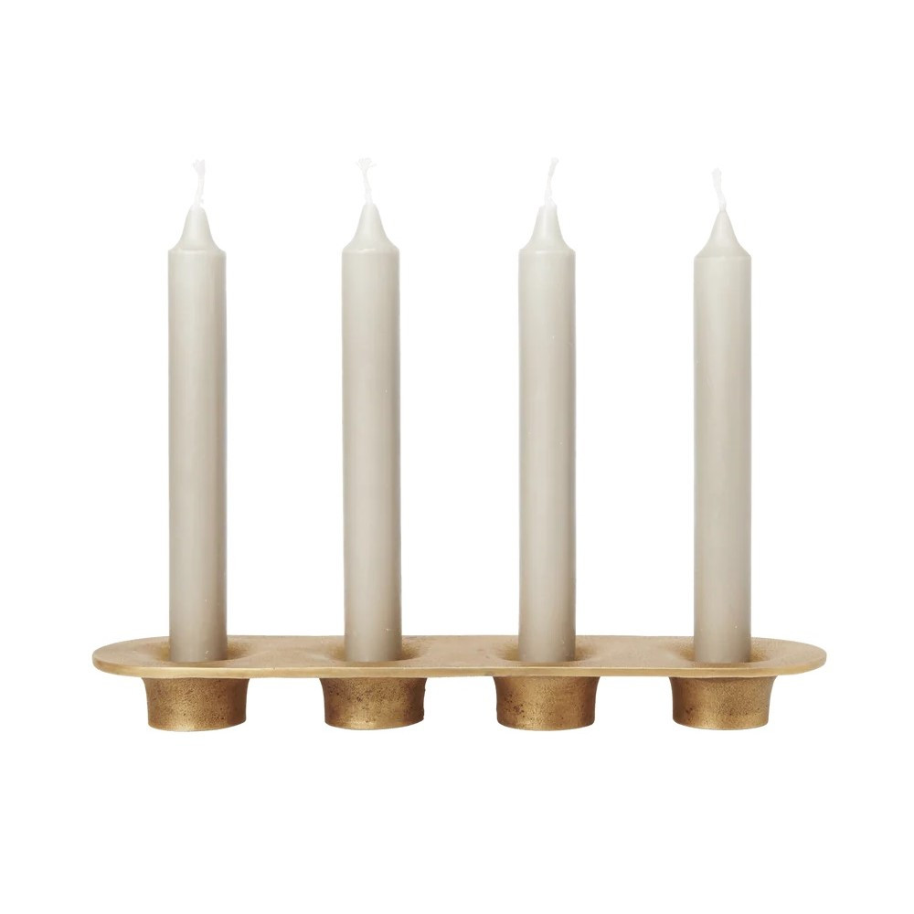 Soothe duńskiej marki Ferm Living to elegancki świecznik w mosiężnym wykończeniu, który łączy minimalistyczny skandynawski design z funkcjonalnością. Wykonany w 100% z odlewanego aluminium z recyklingu i wykończony teksturą piaskowego odlewu, prezentuje się lekko, a jednocześnie solidnie. Pomieści cztery świece, oferując nowoczesną alternatywę dla klasycznych wieńców adwentowych.