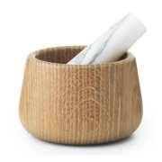 Moździerz z serii Craft marki Normann Copenhagen to wysokiej jakości akcesorium kuchenne wykonane z ekskluzywnych materiałów. Solidny dąb i wytrzymały marmur sprawiają, że moździerz z tłuczkiem idealnie nadaje się do utarcia wszystkich rodzajów ziół i przypraw. Niewątpliwie doda również luksusowego, skandynawskiego stylu do wystroju kuchni. Niezależnie od tego czy moździerz i tłuczek stoi na stole, w szafce czy też jest używany będzie się prezentował zdumiewająco.