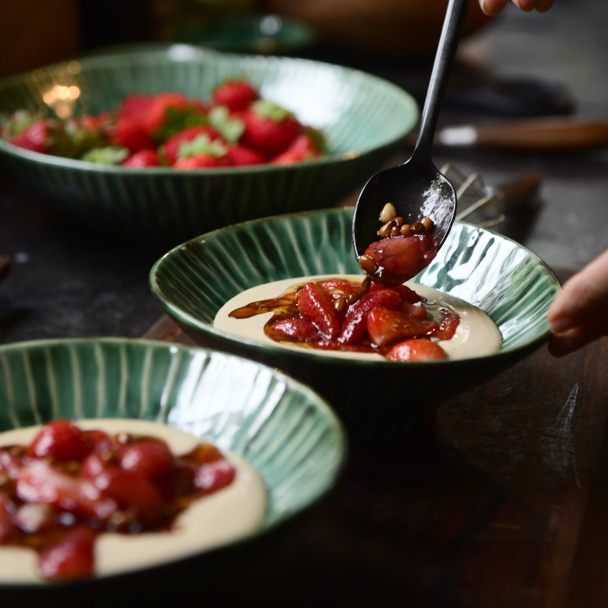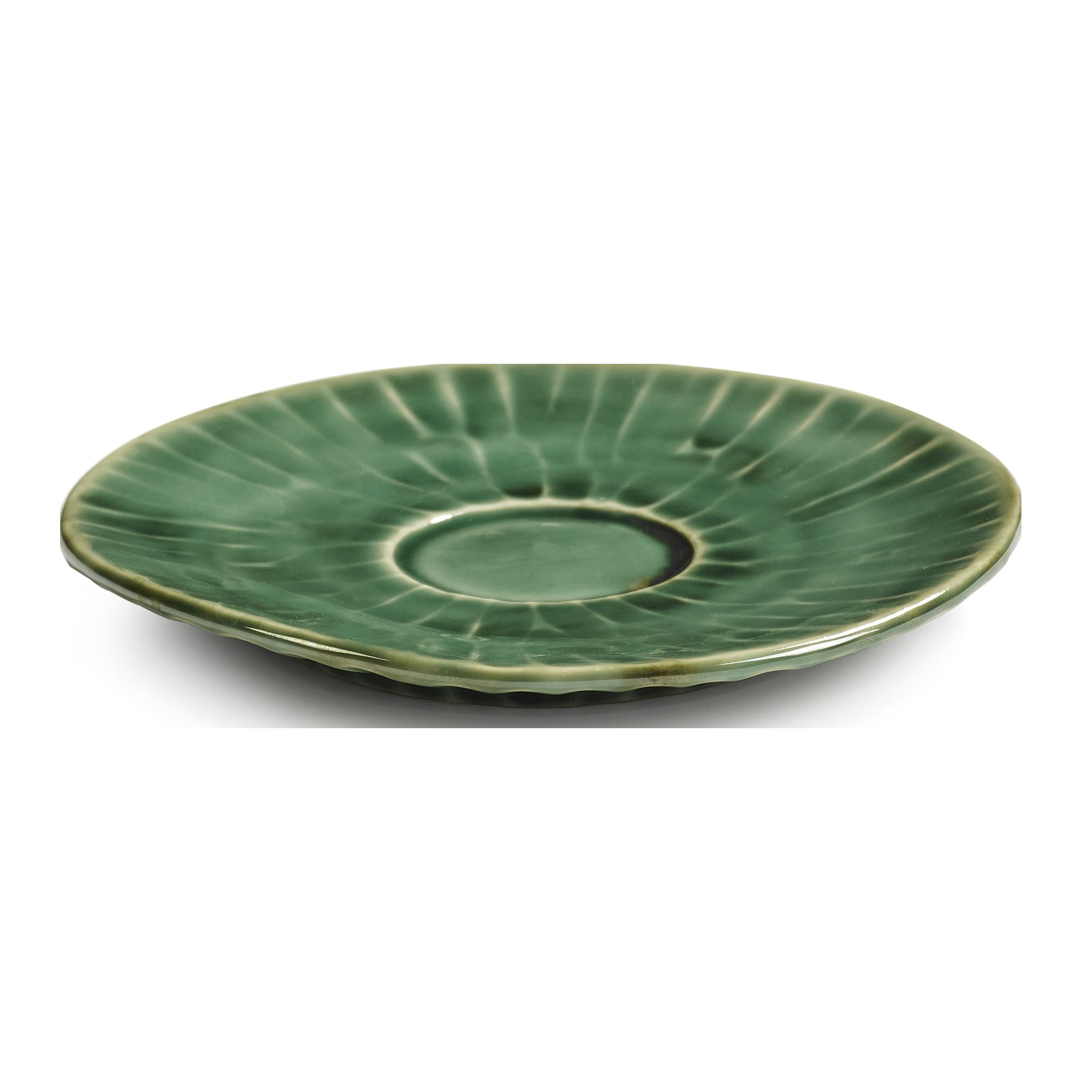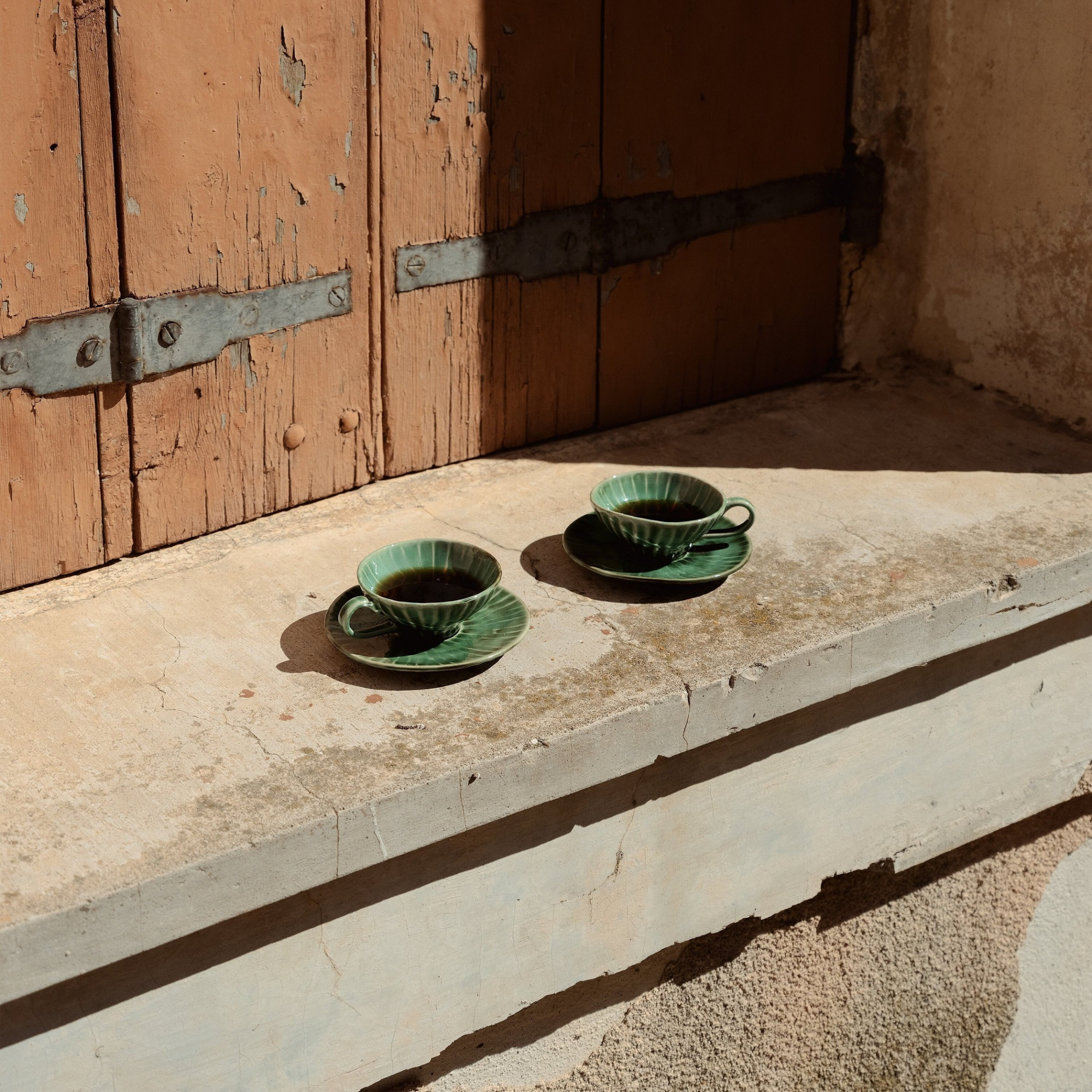 Spodek do filiżanki espresso Green Verde Lanza od Serax to elegancki element kolekcji zaprojektowanej przez Pascale Naessens, inspirowanej kontrastem między soczystą zielenią natury a surowym, wulkanicznym krajobrazem Lanzarote. Charakterystyczne szkliwo o „sun-worn” wykończeniu oraz ręcznie nadawana, muszelkowa faktura sprawiają, że każdy element zastawy ma unikalny, rzemieślniczy charakter i naturalną, organiczną estetykę.
