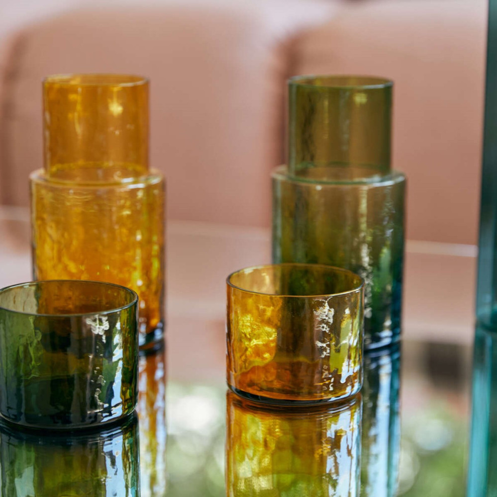 Szklanka dostępna jest w 2 kolorach; bursztynowym i zielonym. Do kompletu polecamy karafkę z tej samej kolekcji w podobnym zestawieniu kolorystycznym.