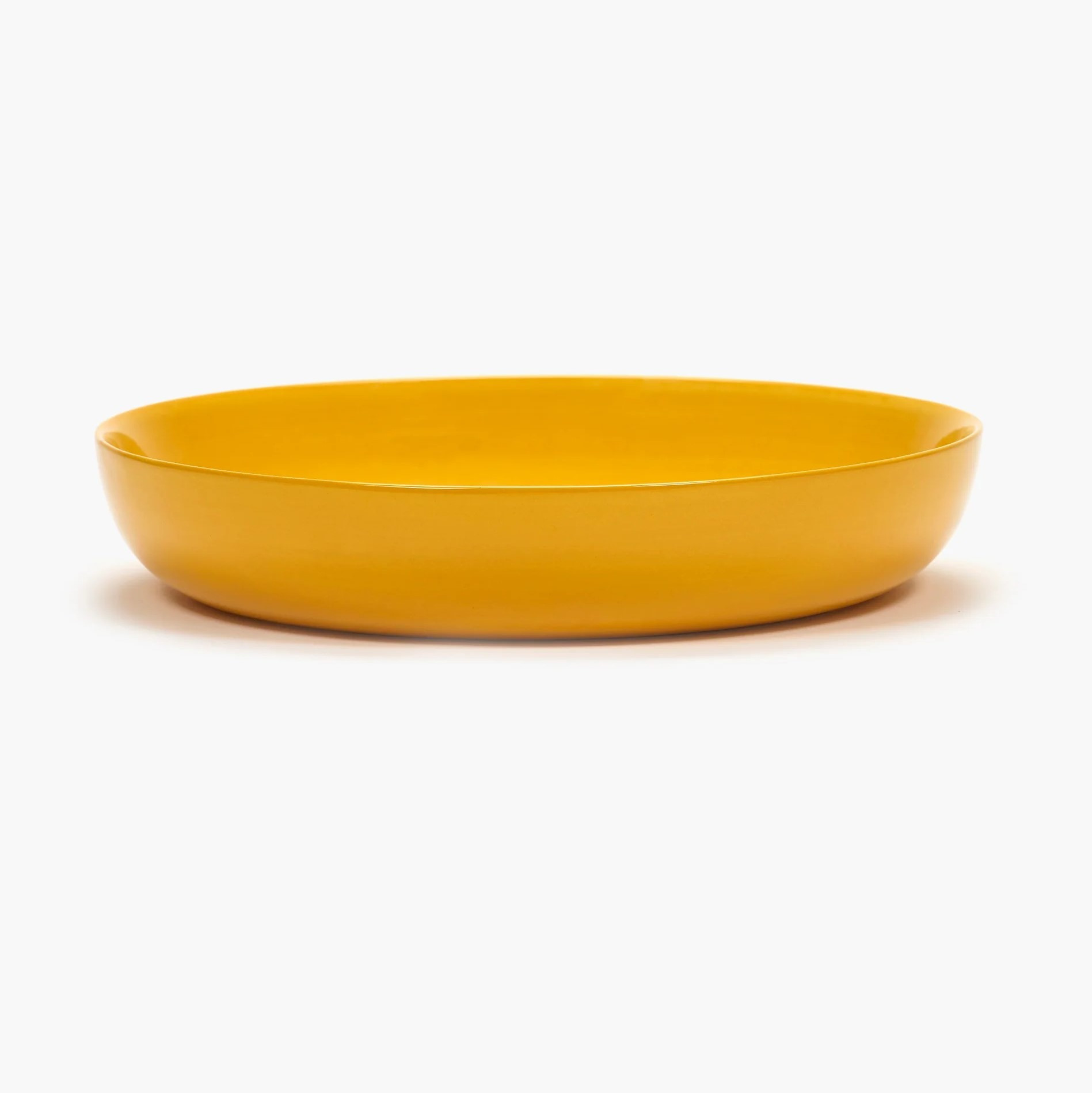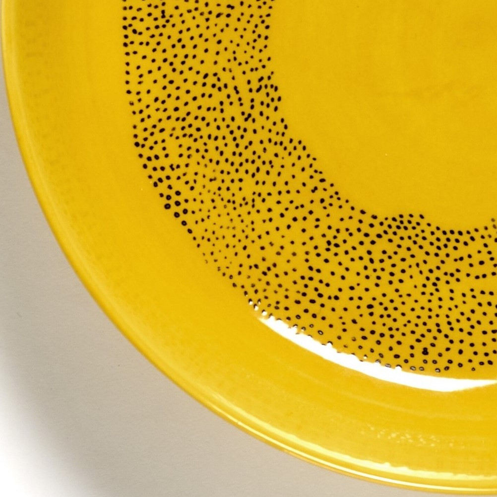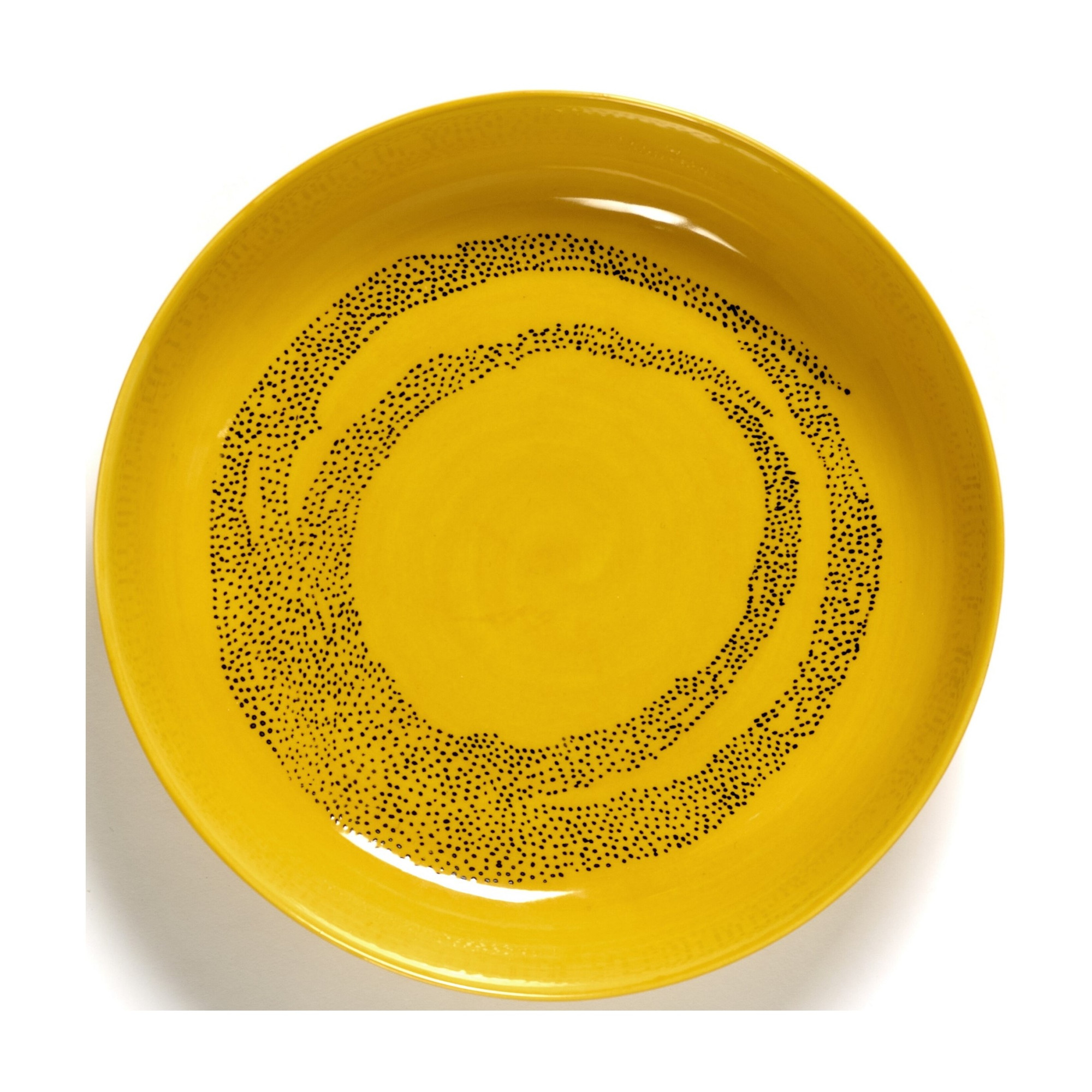 Talerz głęboki z kolekcji Feast marki Serax to wyrazisty element zastawy, który łączy intensywny kolor z artystyczną swobodą formy. Żółty odcień zestawiony z kontrastowymi, czarnymi, ręcznie malowanymi kropkami nadaje każdej aranżacji stołu energię, lekkość i nowoczesny, graficzny charakter. To esencja kolekcji stworzonej we współpracy z Yotam Ottolenghi – pełnej koloru, ekspresji i nieoczywistych zestawień.
