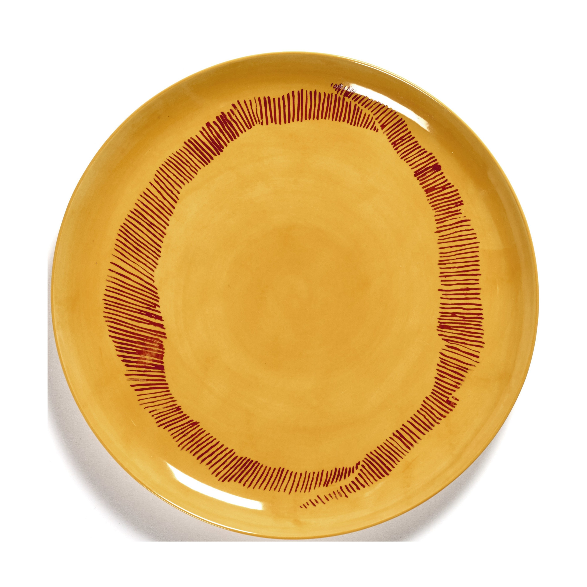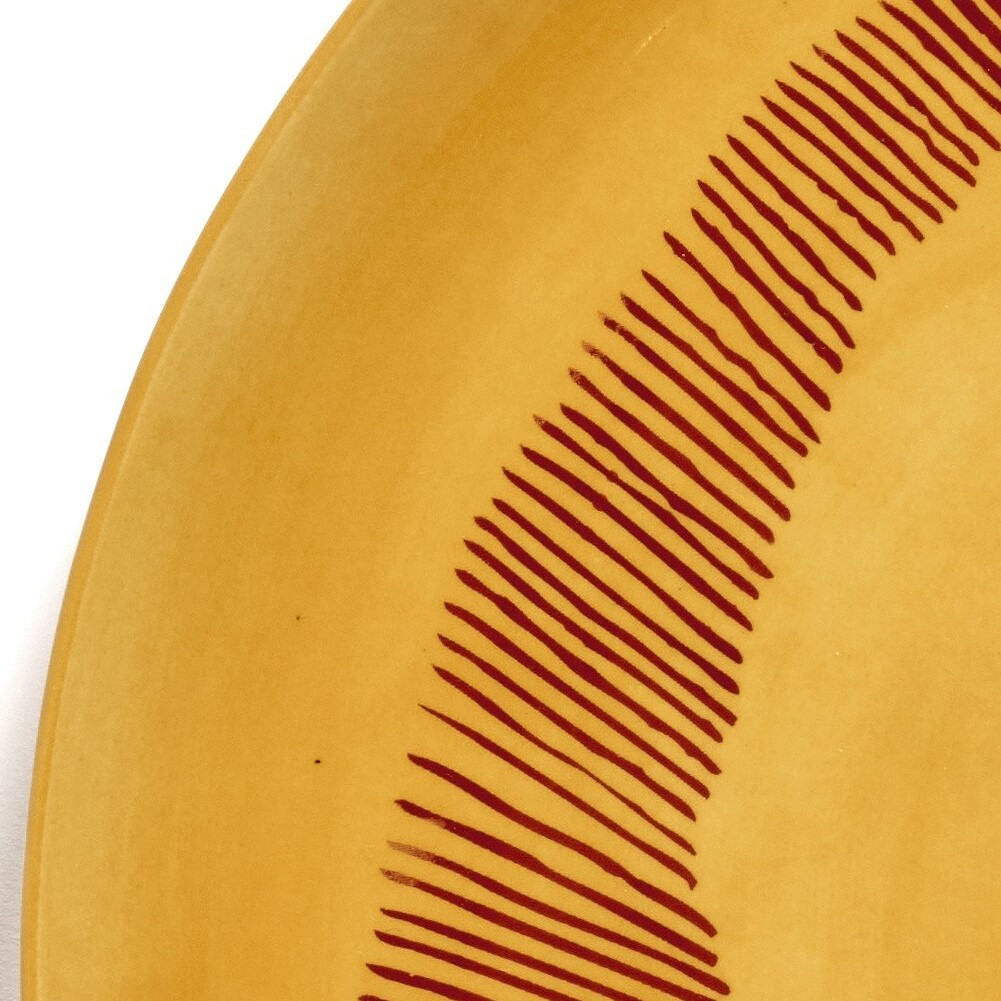 Talerz obiadowy z kolekcji Feast marki Serax to wyrazisty element zastawy, który łączy intensywne kolory z artystyczną swobodą formy. Połączenie ciepłej żółci i energetycznej czerwieni z organicznymi, ręcznie malowanymi pociągnięciami pędzla nadaje każdej aranżacji stołu wyjątkową dynamikę, lekkość i radosny charakter. To esencja kolekcji stworzonej we współpracy z Yotam Ottolenghi – pełnej koloru, ekspresji i nieoczywistych zestawień.