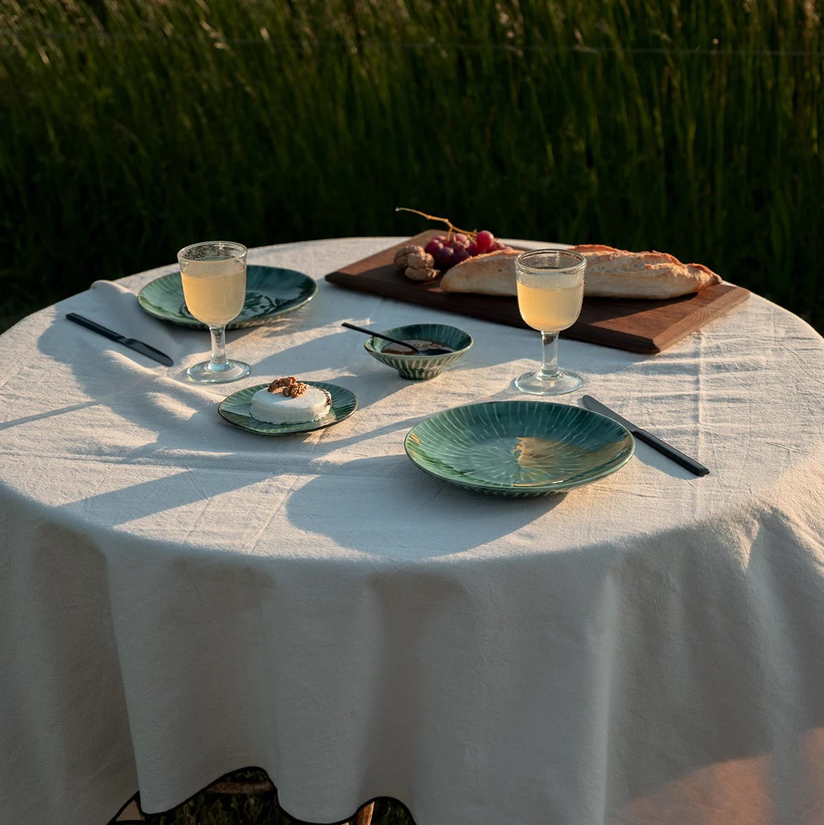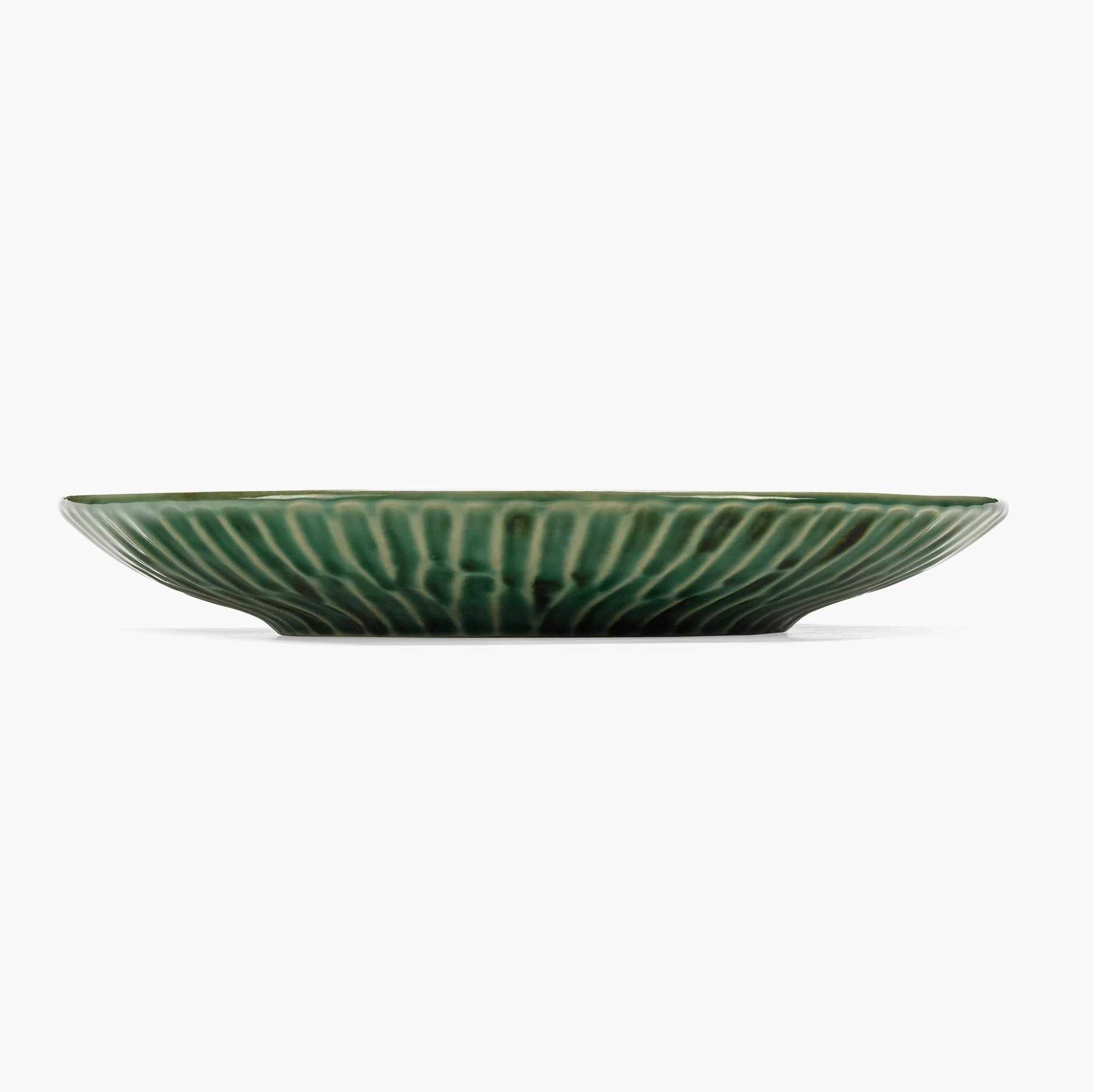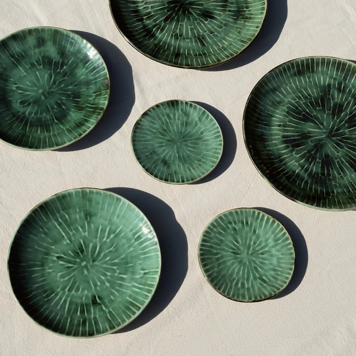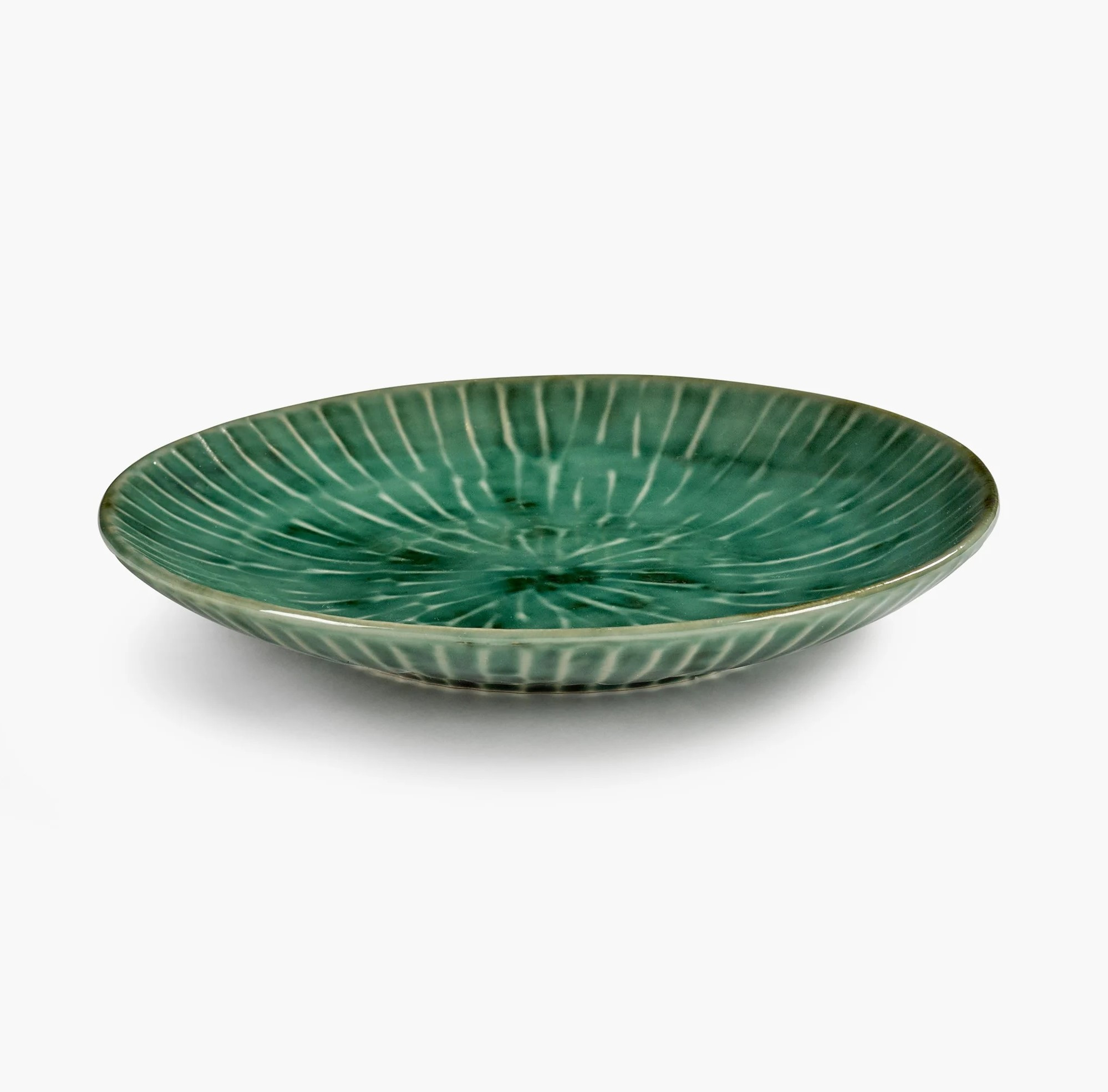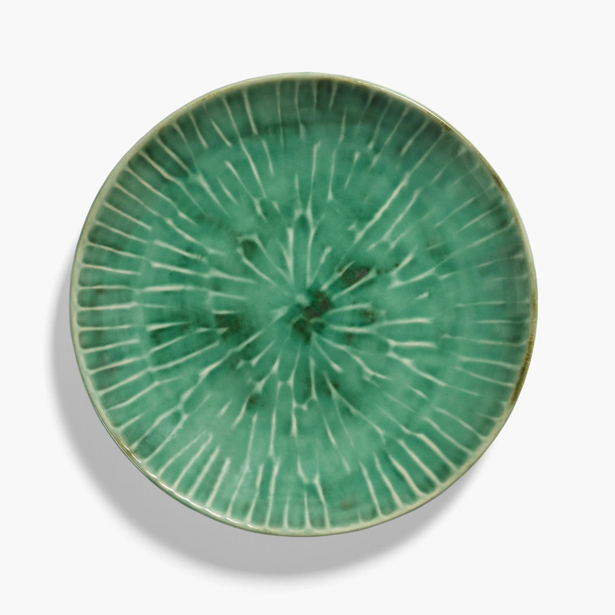 Talerz obiadowy z kolekcji Verde Lanza belgijskiej marki Serax. Inspirowany kontrastem między soczystą zielenią natury a surowym, wulkanicznym krajobrazem Lanzarote. To połączenie natury i rzemiosła przekłada się na unikalny charakter kolekcji, w której każdy element ma swoją indywidualną tożsamość. Zielone szkliwo o „sun-worn” wykończeniu subtelnie podkreśla potrawy z różnych kuchni świata, tworząc elegancką i naturalną oprawę stołu.