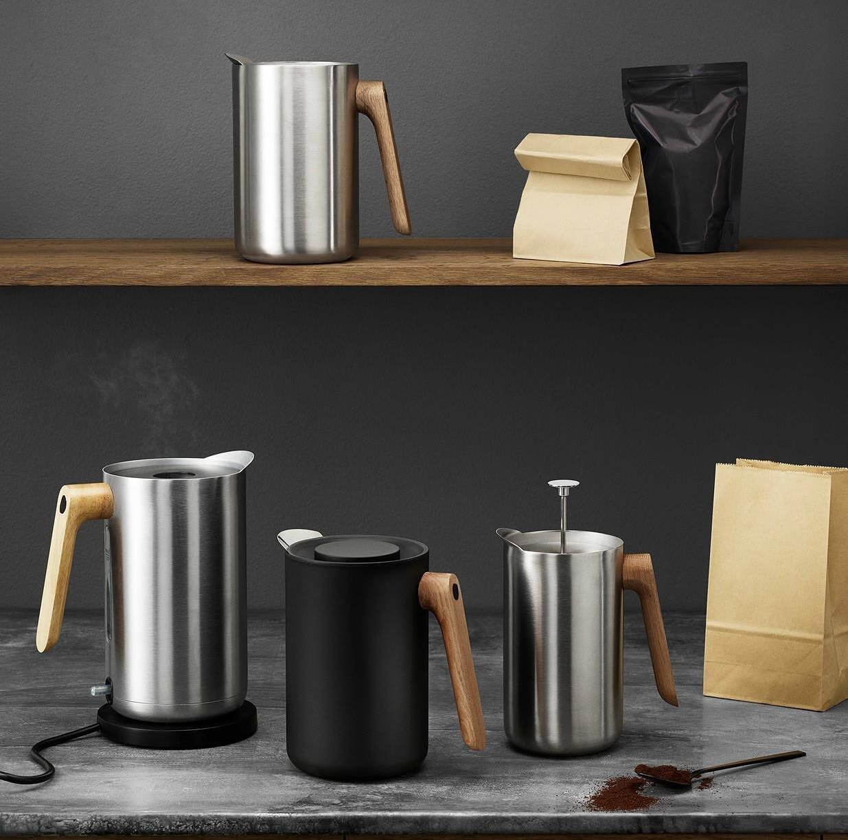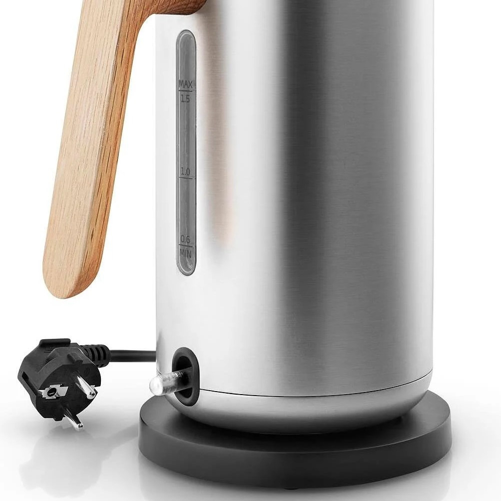 Czajnik elektryczny Eva Solo Nordic Kitchen to połączenie minimalistycznego skandynawskiego designu i funkcjonalności na co dzień. Wykonany z matowej stali nierdzewnej z eleganckim uchwytem z drewna dębowego, doskonale prezentuje się zarówno w kuchni, jak i bezpośrednio na stole podczas serwowania napojów.