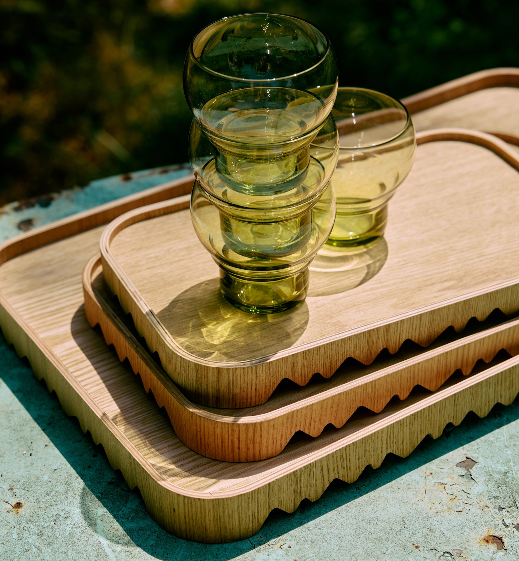 Taca do serwowania z katalogu holenderskiej marki HKliving. Wykonana w 100% z drewna jesionowego, z ciepłym, brązowym fornirem, wyróżnia się delikatnie pofalowanymi krawędziami, które nadają jej elegancji i charakteru. Minimalistyczny kształt i antypoślizgowa powierzchnia sprawiają, że codzienne serwowanie napojów, przekąsek czy śniadań staje się przyjemnością.