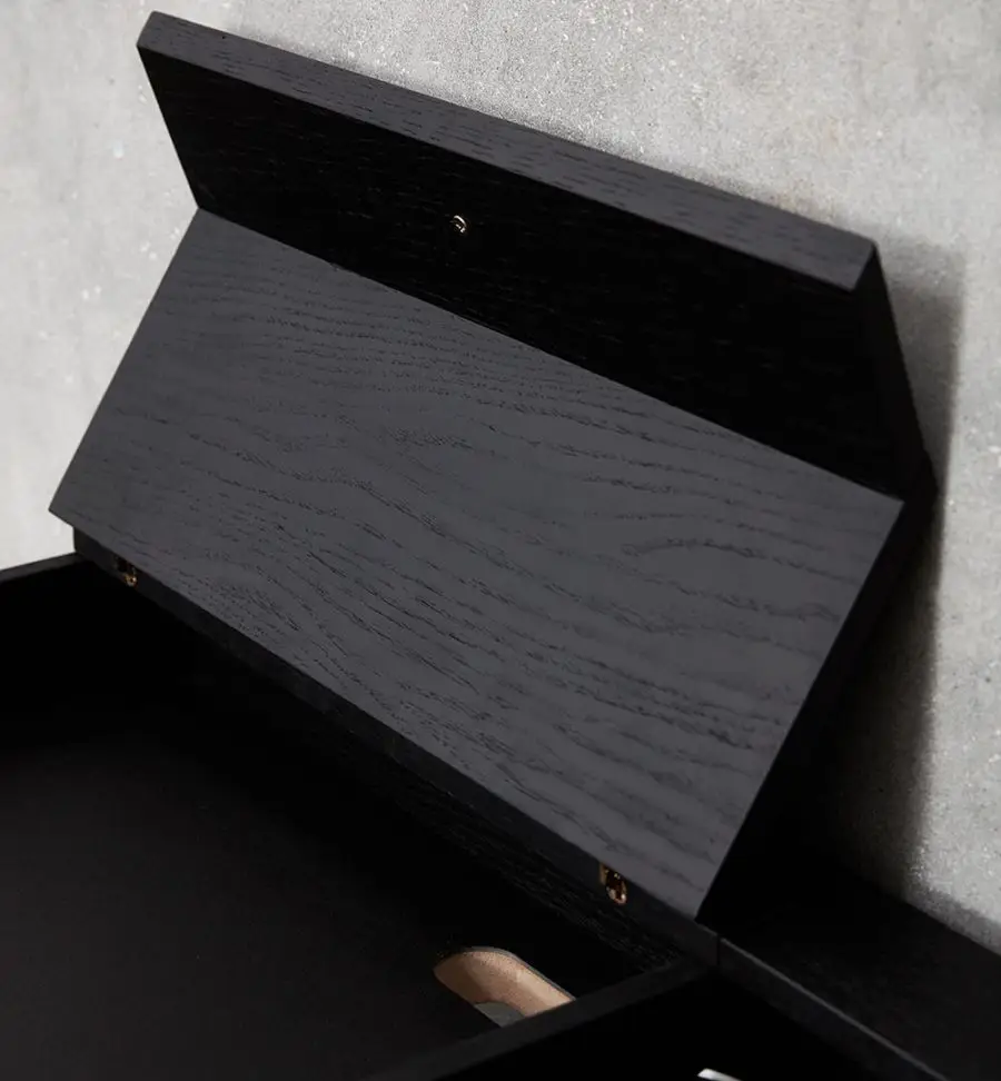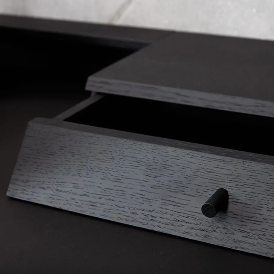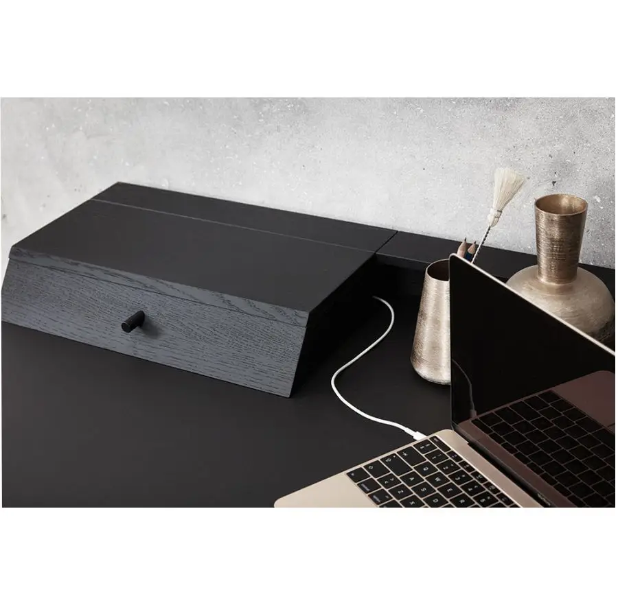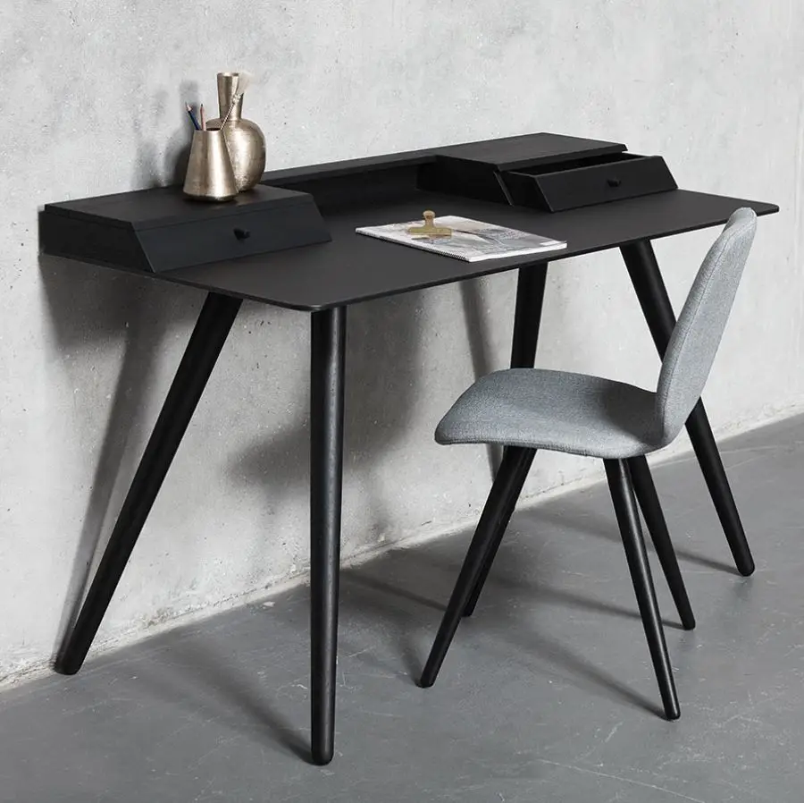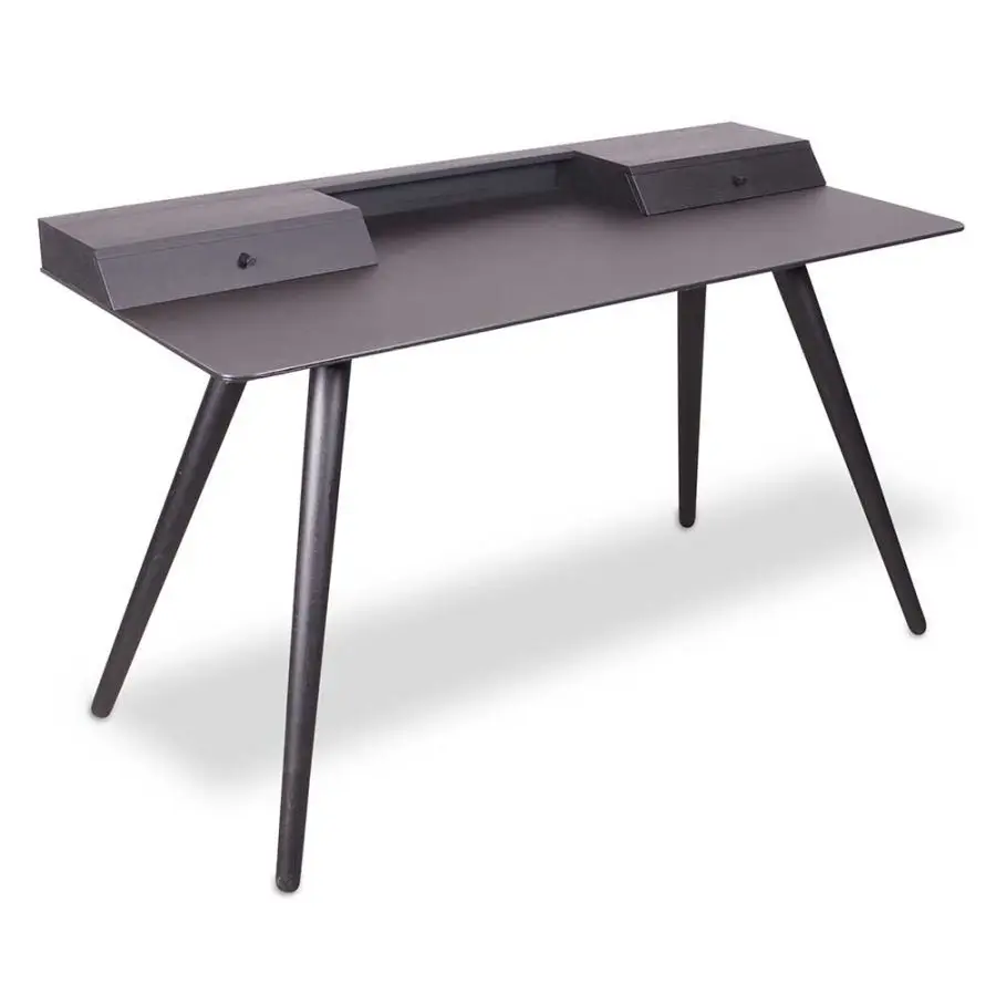 Nowoczesne, drewniane biurko wyposażone w dwie szuflady. Szuflady umieszczone zostały na blacie przez to tworzą się dodatkowe dwie półki na biurku przydatne np; na lampkę biurkową czy organizer. Nogi wykonane z litego drewna.