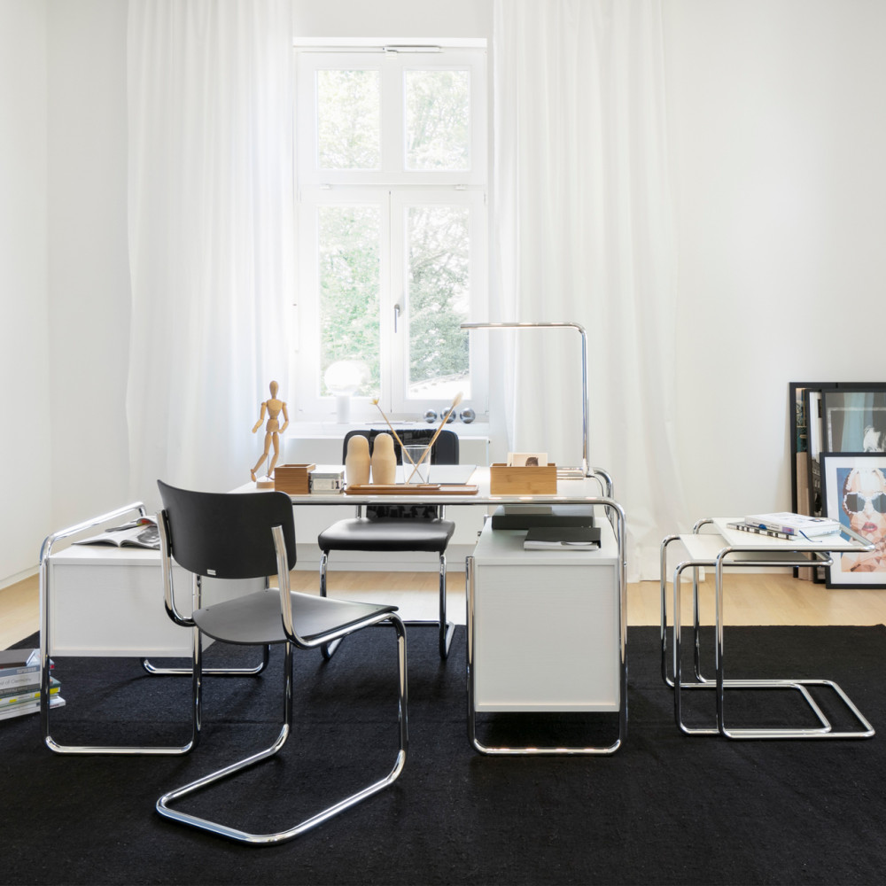 Biurko S 285/2, zaprojektowane w 1935 roku przez Marcela Breuera, to ponadczasowy klasyk, który harmonijnie łączy sztukę z technologią, wpisując się w estetykę Bauhausu. Jego kompaktowa forma i elegancki design sprawiają, że jest idealnym towarzyszem współczesnego stylu życia i pracy.