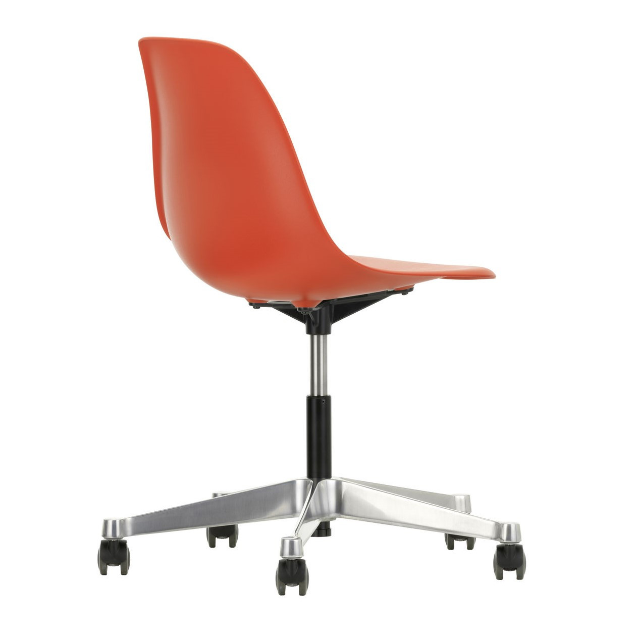Krzesło Eames Plastic PSCC od Vitra łączy ikoniczny design Charlesa i Ray Eames z funkcjonalnością idealną do biur, domowych gabinetów i kreatywnych przestrzeni. Obrotowe siedzisko wykonane z post-consumer recycled plastic (RE) zapewnia wygodę dzięki amortyzacji i regulacji wysokości, a stabilna pięcioramienna podstawa z polerowanego aluminium z kółkami Soft Braked umożliwia płynne przesuwanie po twardych podłogach, bez ryzyka ich zarysowania.