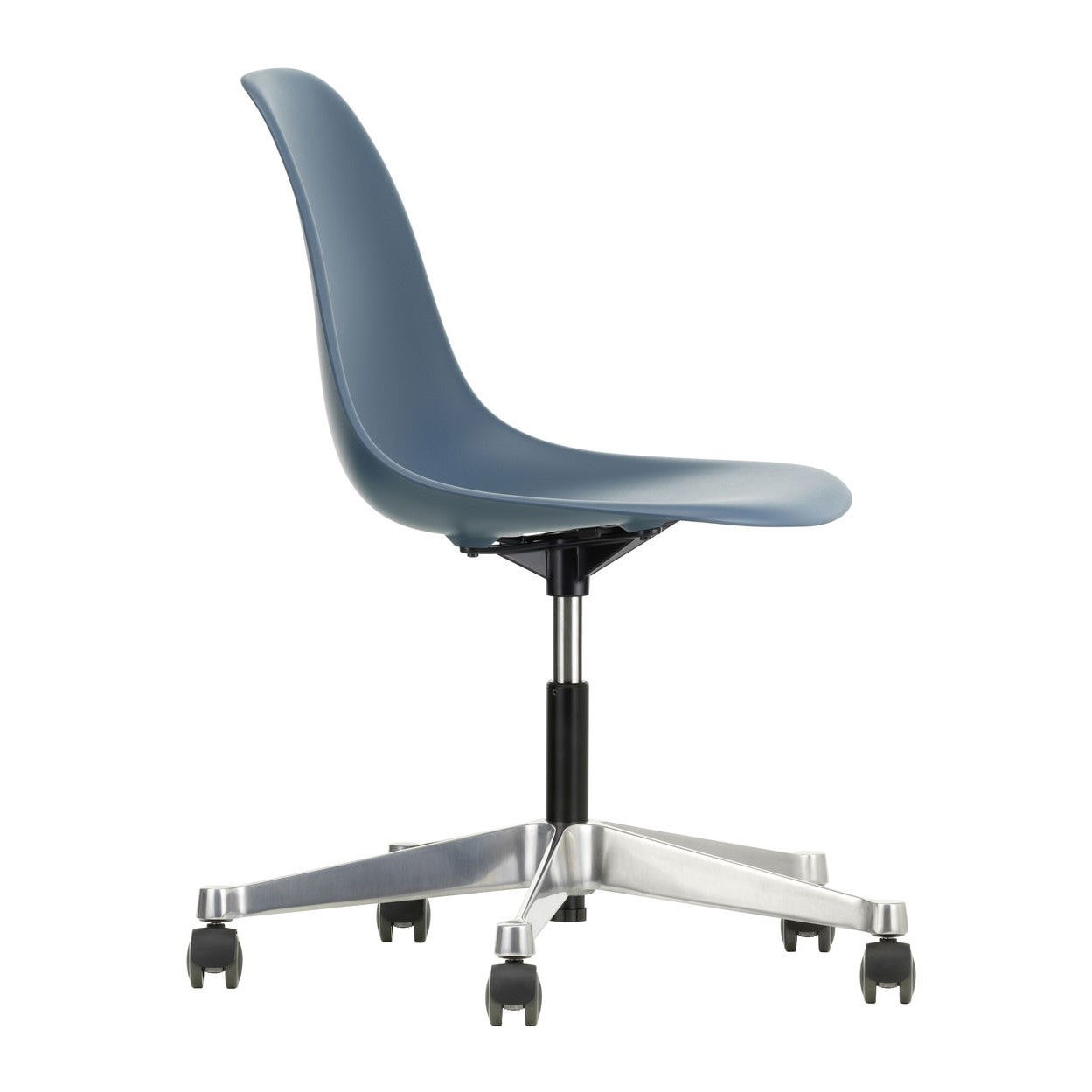 Krzesło Eames Plastic PSCC od Vitra łączy ikoniczny design Charlesa i Ray Eames z funkcjonalnością idealną do biur, domowych gabinetów i kreatywnych przestrzeni. Obrotowe siedzisko wykonane z post-consumer recycled plastic (RE) zapewnia wygodę dzięki amortyzacji i regulacji wysokości, a stabilna pięcioramienna podstawa z polerowanego aluminium z kółkami Soft Braked umożliwia płynne przesuwanie po twardych podłogach, bez ryzyka ich zarysowania.
