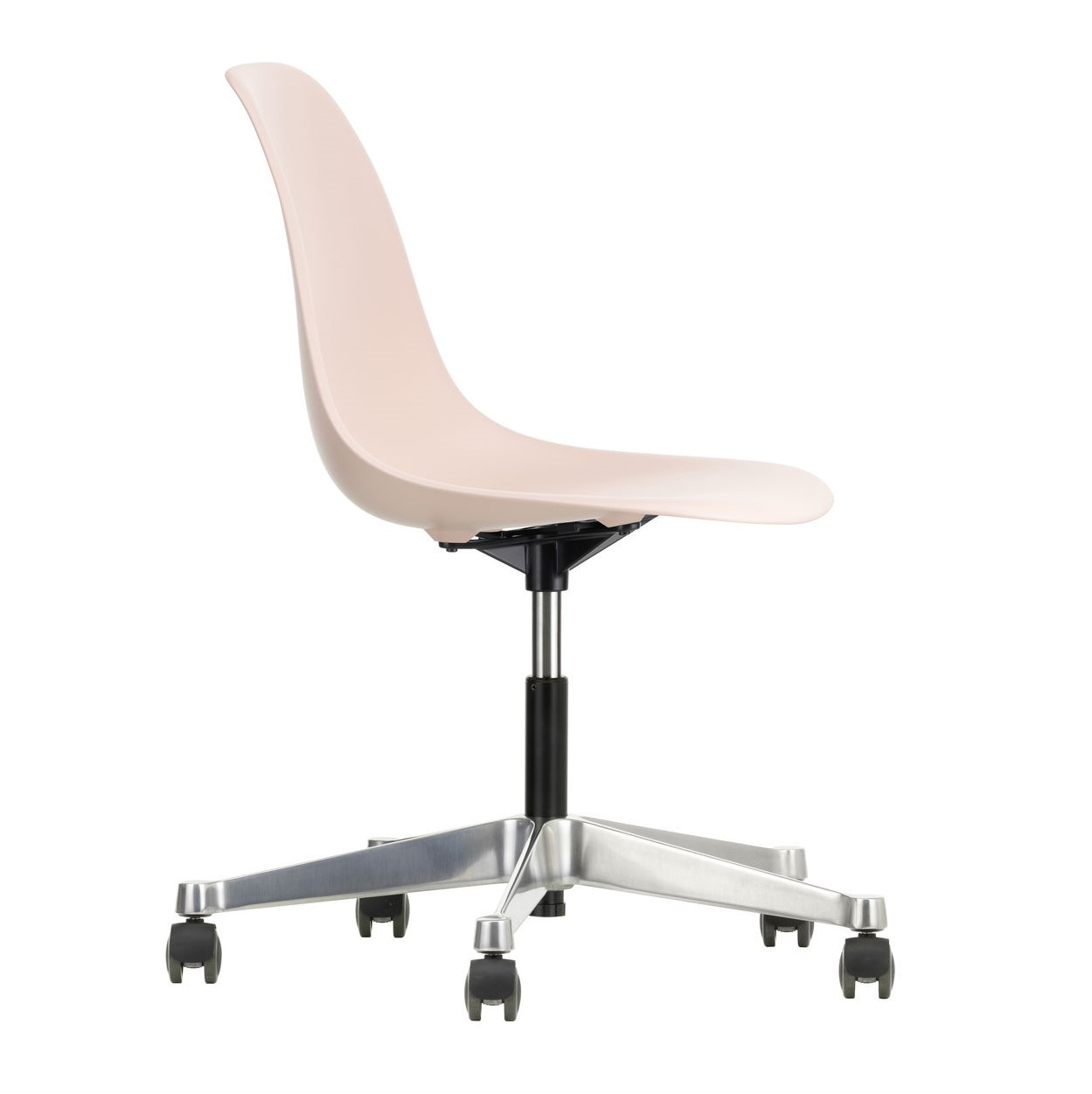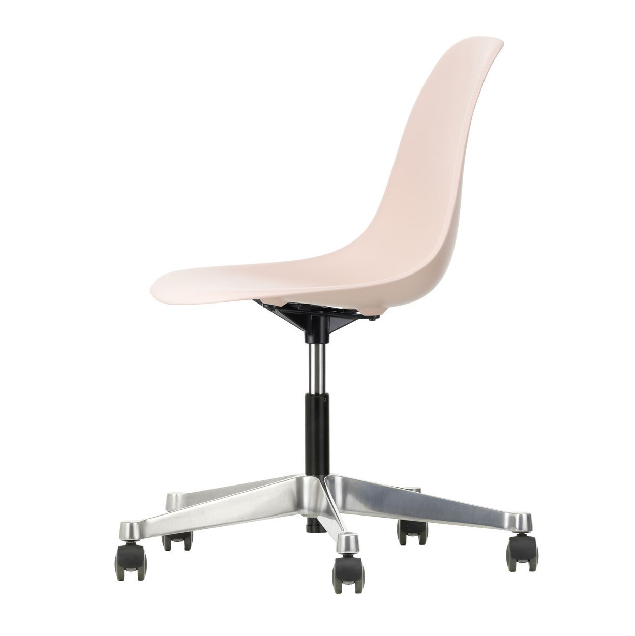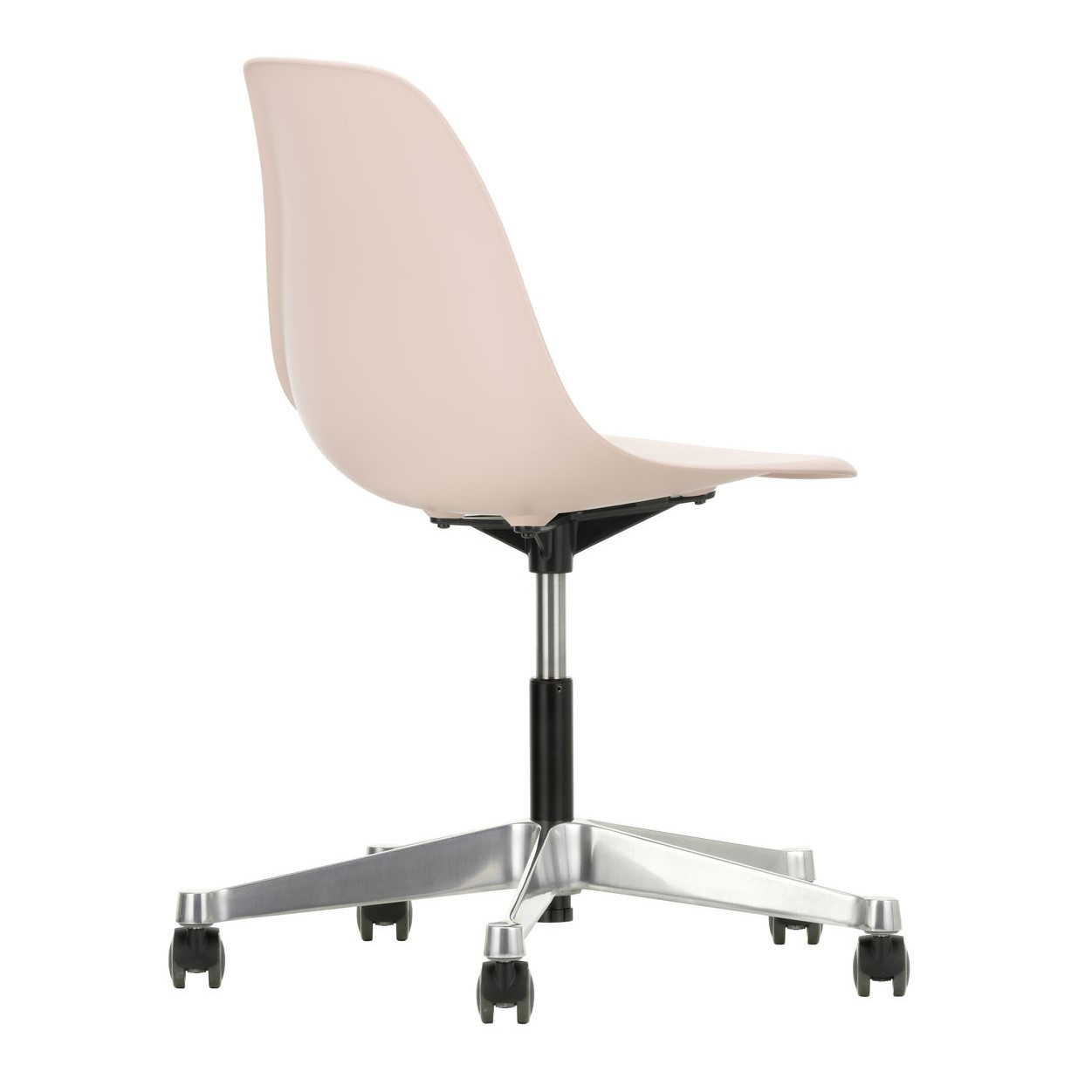 Krzesło Eames Plastic PSCC od Vitra łączy ikoniczny design Charlesa i Ray Eames z funkcjonalnością idealną do biur, domowych gabinetów i kreatywnych przestrzeni. Obrotowe siedzisko wykonane z post-consumer recycled plastic (RE) zapewnia wygodę dzięki amortyzacji i regulacji wysokości, a stabilna pięcioramienna podstawa z polerowanego aluminium z kółkami Soft Braked umożliwia płynne przesuwanie po twardych podłogach, bez ryzyka ich zarysowania.