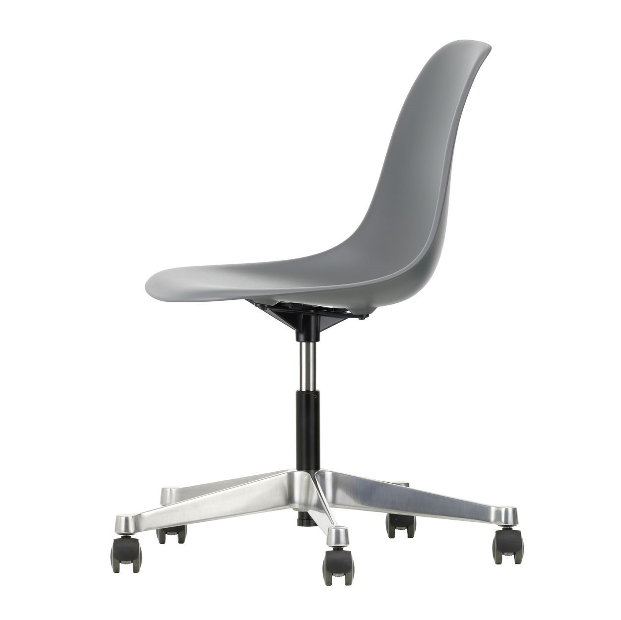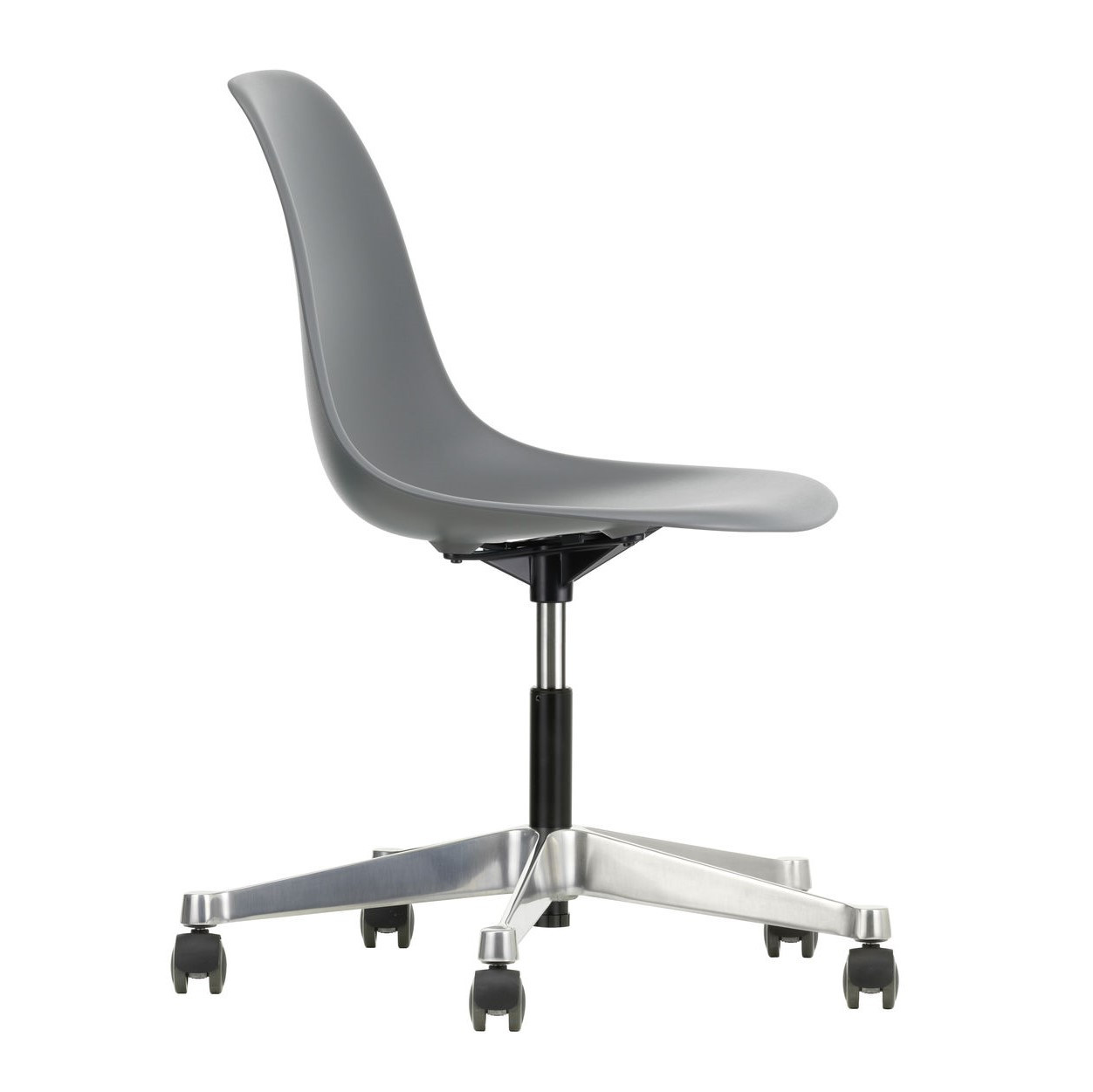 Krzesło Eames Plastic PSCC od Vitra łączy ikoniczny design Charlesa i Ray Eames z funkcjonalnością idealną do biur, domowych gabinetów i kreatywnych przestrzeni. Obrotowe siedzisko wykonane z post-consumer recycled plastic (RE) zapewnia wygodę dzięki amortyzacji i regulacji wysokości, a stabilna pięcioramienna podstawa z polerowanego aluminium z kółkami Soft Braked umożliwia płynne przesuwanie po twardych podłogach, bez ryzyka ich zarysowania.