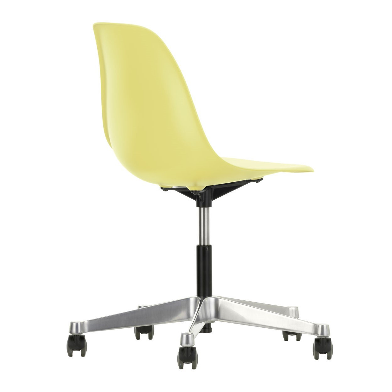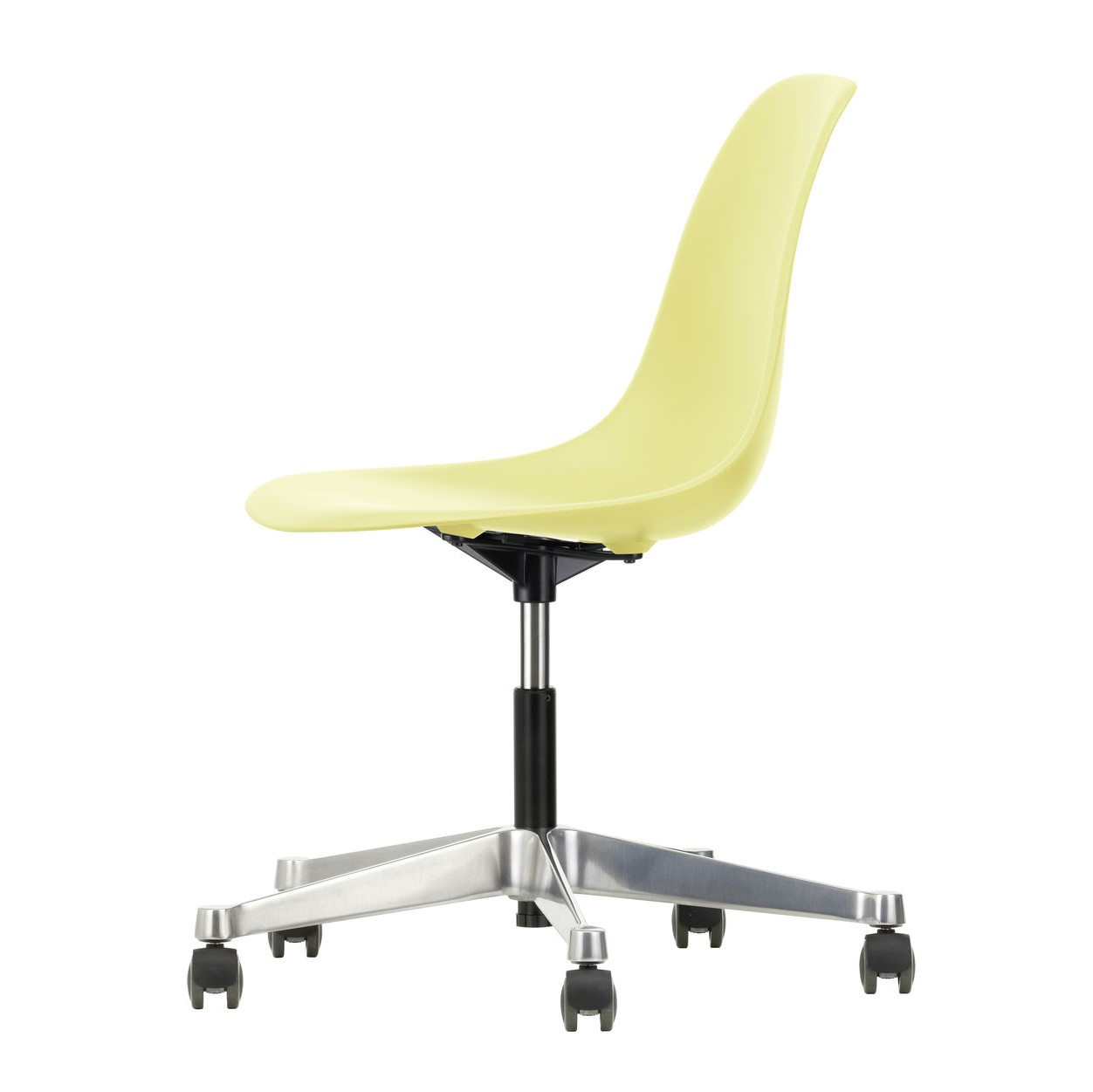 Krzesło Eames Plastic PSCC od Vitra łączy ikoniczny design Charlesa i Ray Eames z funkcjonalnością idealną do biur, domowych gabinetów i kreatywnych przestrzeni. Obrotowe siedzisko wykonane z post-consumer recycled plastic (RE) zapewnia wygodę dzięki amortyzacji i regulacji wysokości, a stabilna pięcioramienna podstawa z polerowanego aluminium z kółkami Soft Braked umożliwia płynne przesuwanie po twardych podłogach, bez ryzyka ich zarysowania.