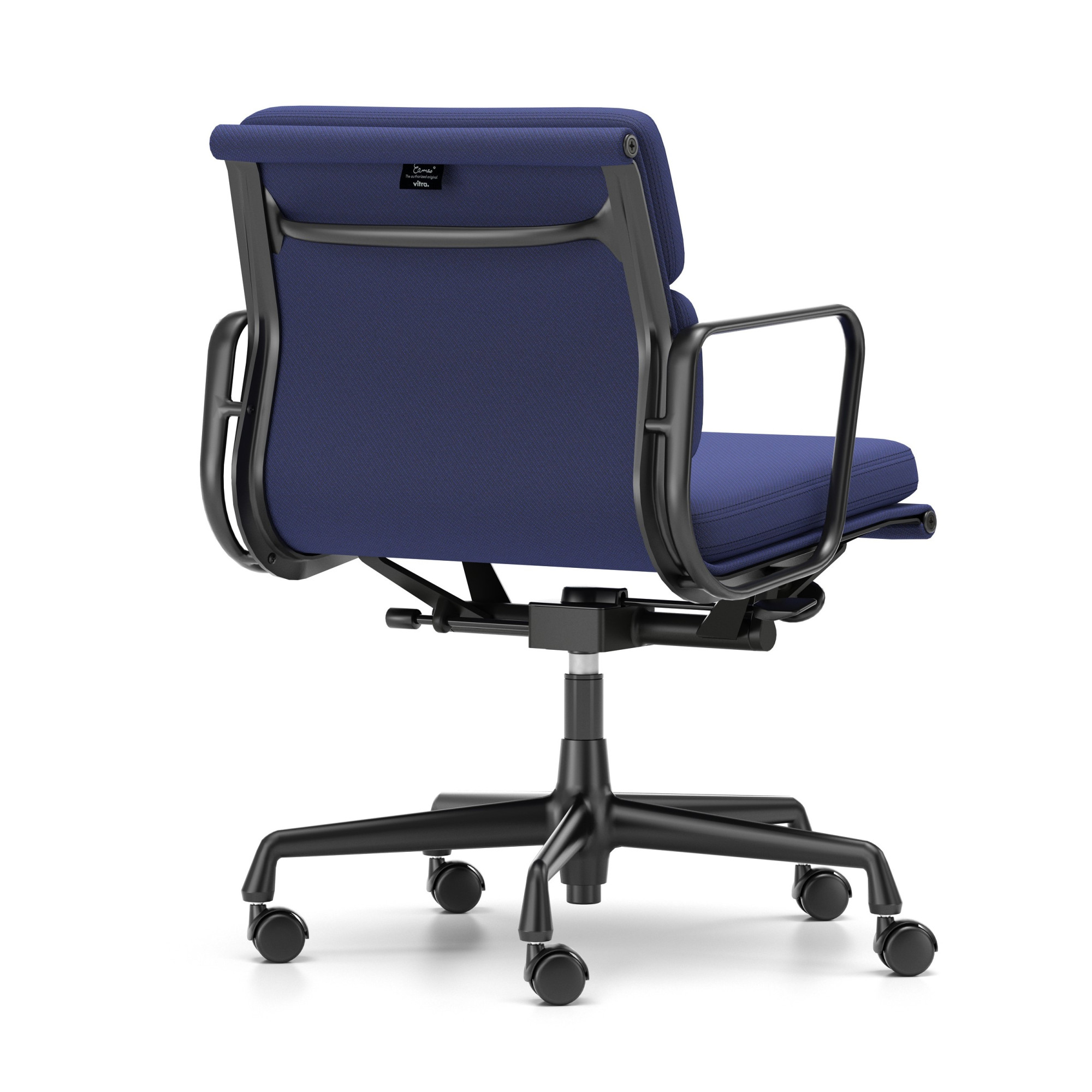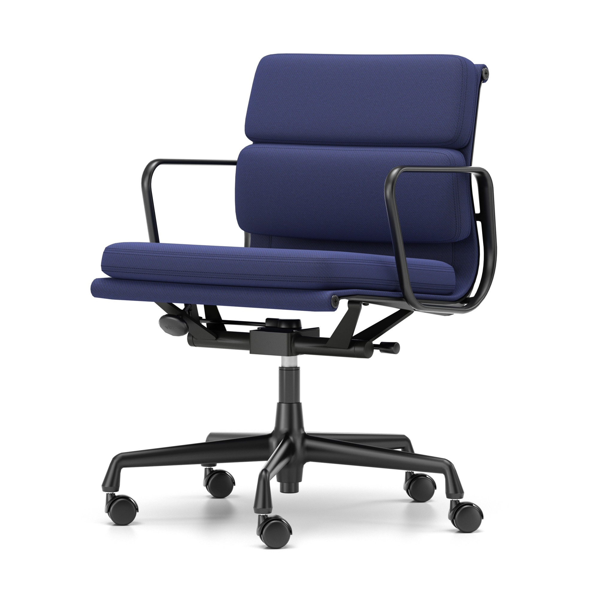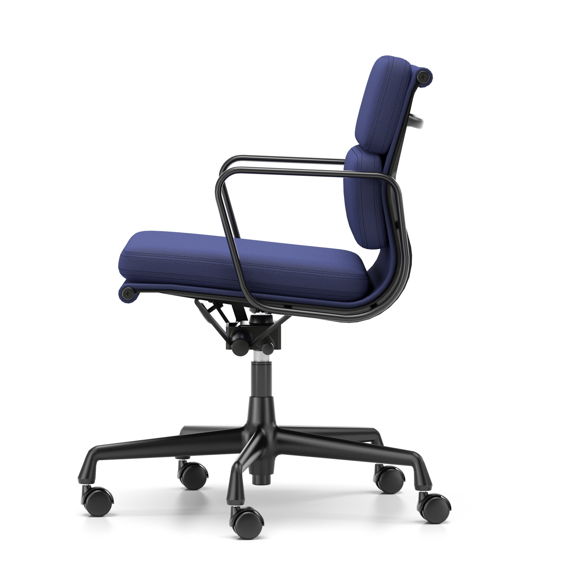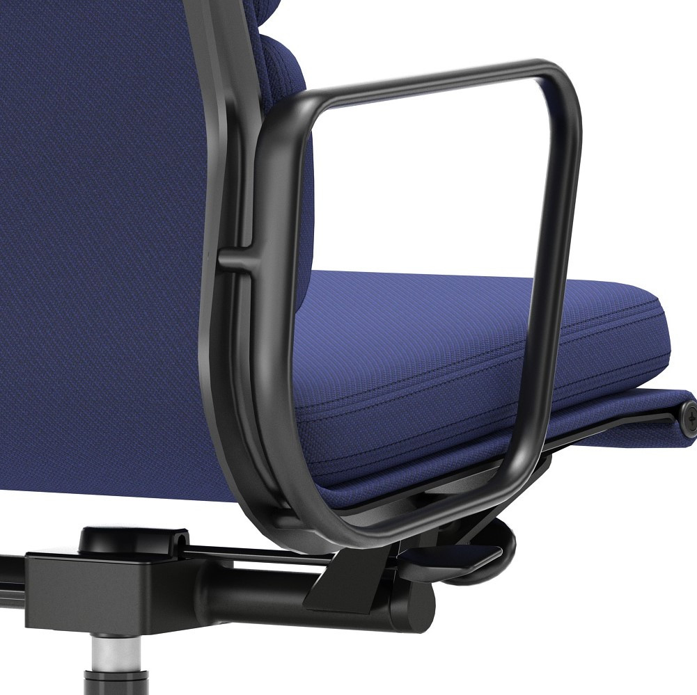 Luksusowe krzesło biurowe EA 217 z kolekcji Soft Pad Chairs łączy ponadczasowy design z wysokim komfortem pracy, idealne zarówno do wnętrz publicznych, jak i domowego biura. Tapicerka w odcieniu Track Royela-Blue Nero połączona z czarną, pięcioramienną podstawą, nadaje wnętrzu profesjonalnego charakteru. Krzesło posiada miękkie kółka do twardych podłóg, idealne do paneli, drewna i płytek, zapewniając płynne przesuwanie i pełną stabilność. Średnio wysokie oparcie oraz regulacja kąta nachylenia i wysokości siedziska gwarantują wygodę nawet przy wielogodzinnej pracy.