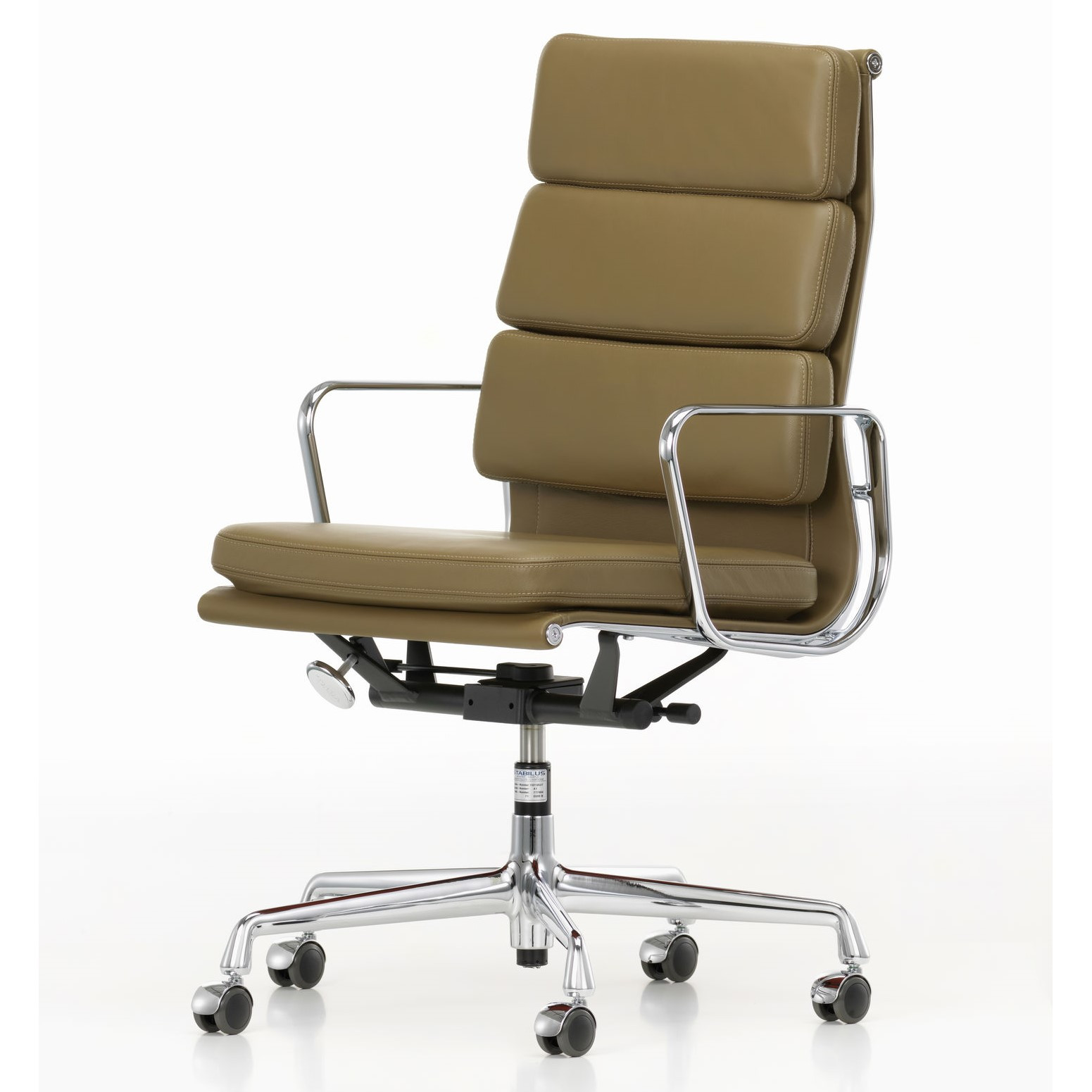 Luksusowe krzesło biurowe EA 219 z kolekcji Soft Pad Chairs łączy ponadczasowy design z wysokim komfortem pracy, idealne zarówno do wnętrz publicznych, jak i domowego biura. Tapicerka skórzana w odcieniu zieleni połączona z chromowaną, pięcioramienną podstawą, nadaje wnętrzu profesjonalnego charakteru. Krzesło posiada miękkie kółka do twardych podłóg, idealne do paneli, drewna i płytek, zapewniając płynne przesuwanie i pełną stabilność. Średnio wysokie oparcie oraz regulacja kąta nachylenia i wysokości siedziska gwarantują wygodę nawet przy wielogodzinnej pracy.