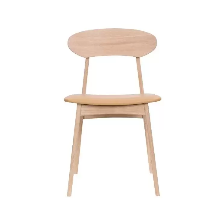 Nowoczesne krzesło do jadalni z tapicerowanym siedziskiem i sklejkowym oparciem. Synonim duńskiego wzornictwa użytkowego we współczesnym wydaniu. Nogi wykonane z litego drewna.