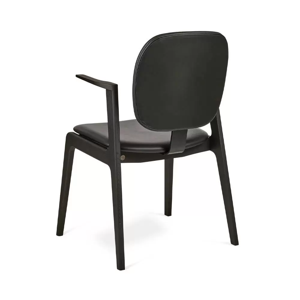 Maron to eleganckie krzesło z wieloma pięknymi detalami jak komfortowe podłokietniki czy szerokie, bardzo wygodne siedzisko. Atrakcyjny, nowoczesny design, za sprawą którego krzesło znakomicie zaaranżuje najróżniejsze domowe czy komercyjne wnętrza. Siedzisko i oparcie tapicerowane naturalną skórą w czarnym kolorze. Rama dębowa wybarwiona na kolor czarnego dębu.