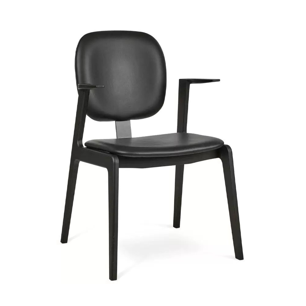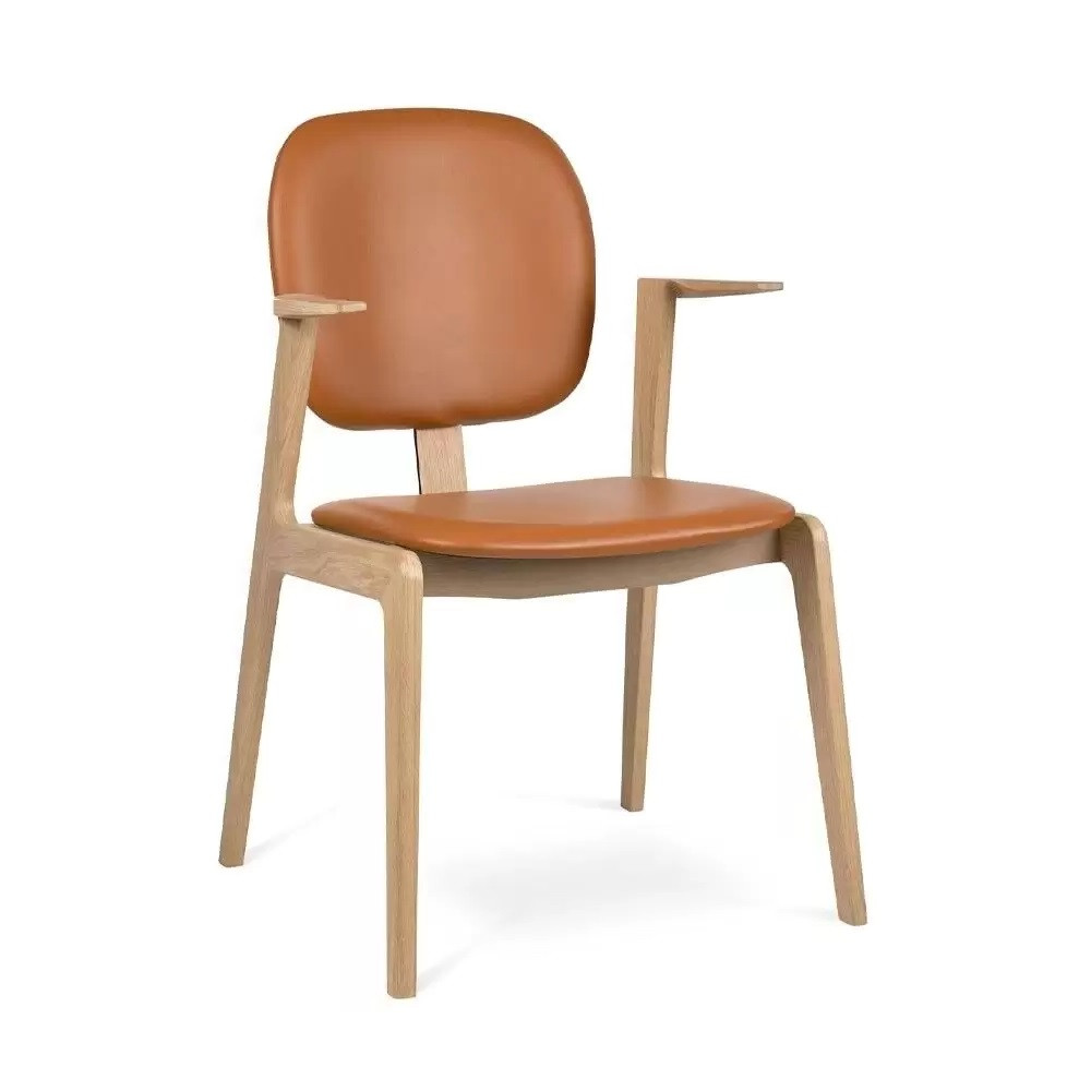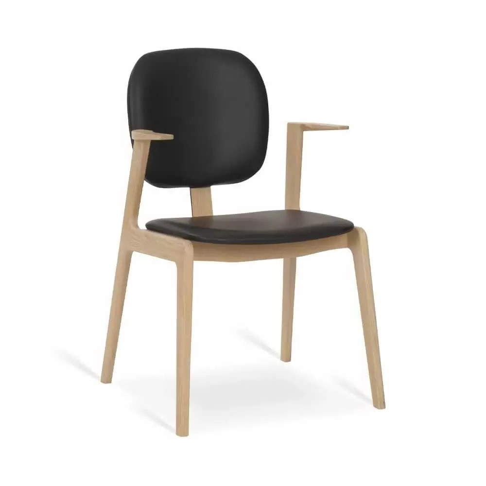Maron to eleganckie krzesło z wieloma pięknymi detalami jak komfortowe podłokietniki czy szerokie, bardzo wygodne siedzisko. Atrakcyjny, nowoczesny design, za sprawą którego krzesło znakomicie zaaranżuje najróżniejsze domowe czy komercyjne wnętrza. Siedzisko i oparcie tapicerowane naturalną skórą w czarnym kolorze. Rama dębowa wybarwiona na kolor jasnego dębu.