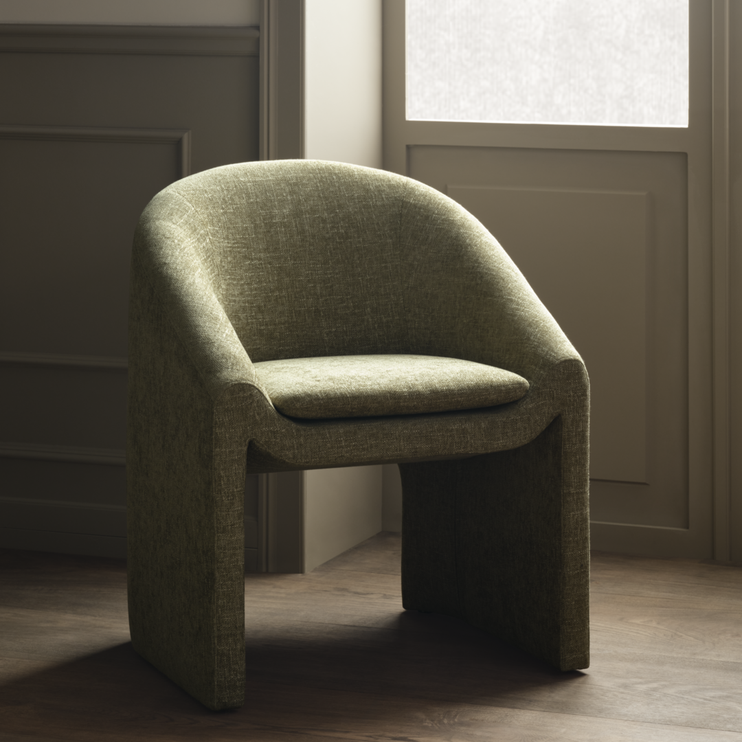Fotel dostępny w różnych tkaninach pozwala dopasować się do indywidualnego stylu (zdjęcia aranżacyjne mają charakter poglądowy i mogą przedstawiać krzesło w różnych tkaninach lub konfiguracjach).