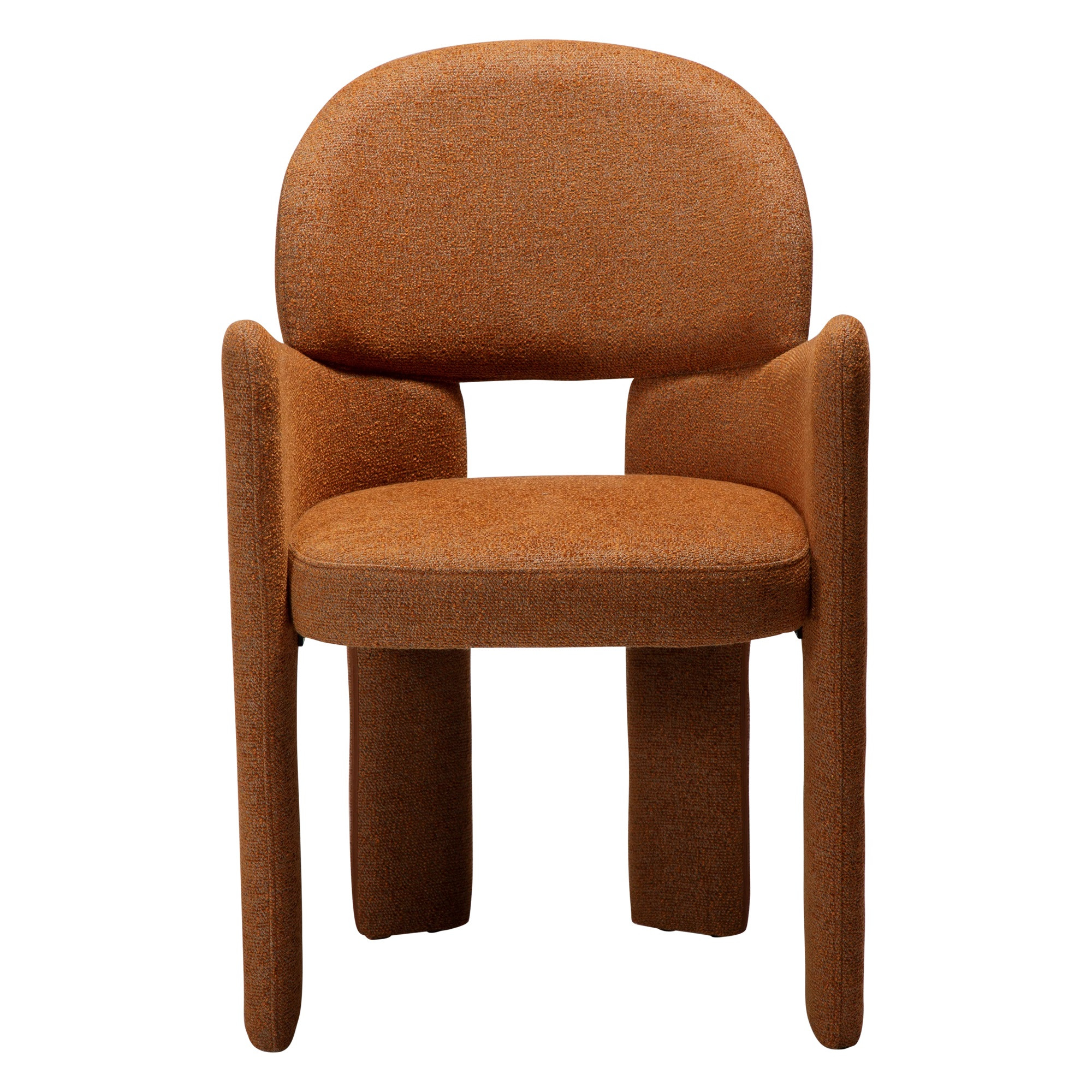 Model wykonano w modnej tkaninie bouclé w modnym kolorze rdzawo-pomarańczowym – przyjemnej w dotyku, miękkiej i niezwykle efektownej wizualnie. Krzesło dostępne jest również w innych wariantach tapicerki, co pozwala łatwo dopasować je do różnych aranżacji wnętrz.