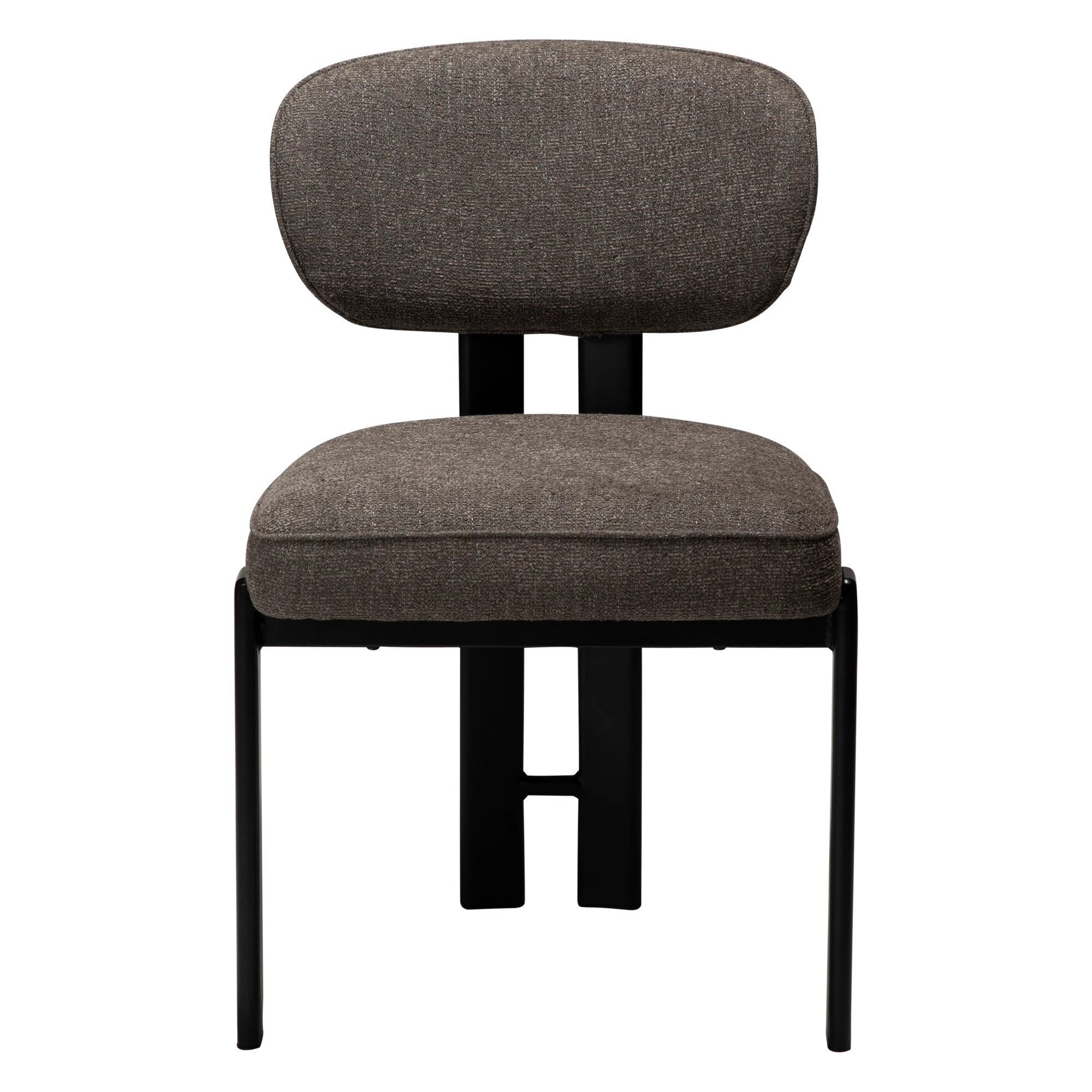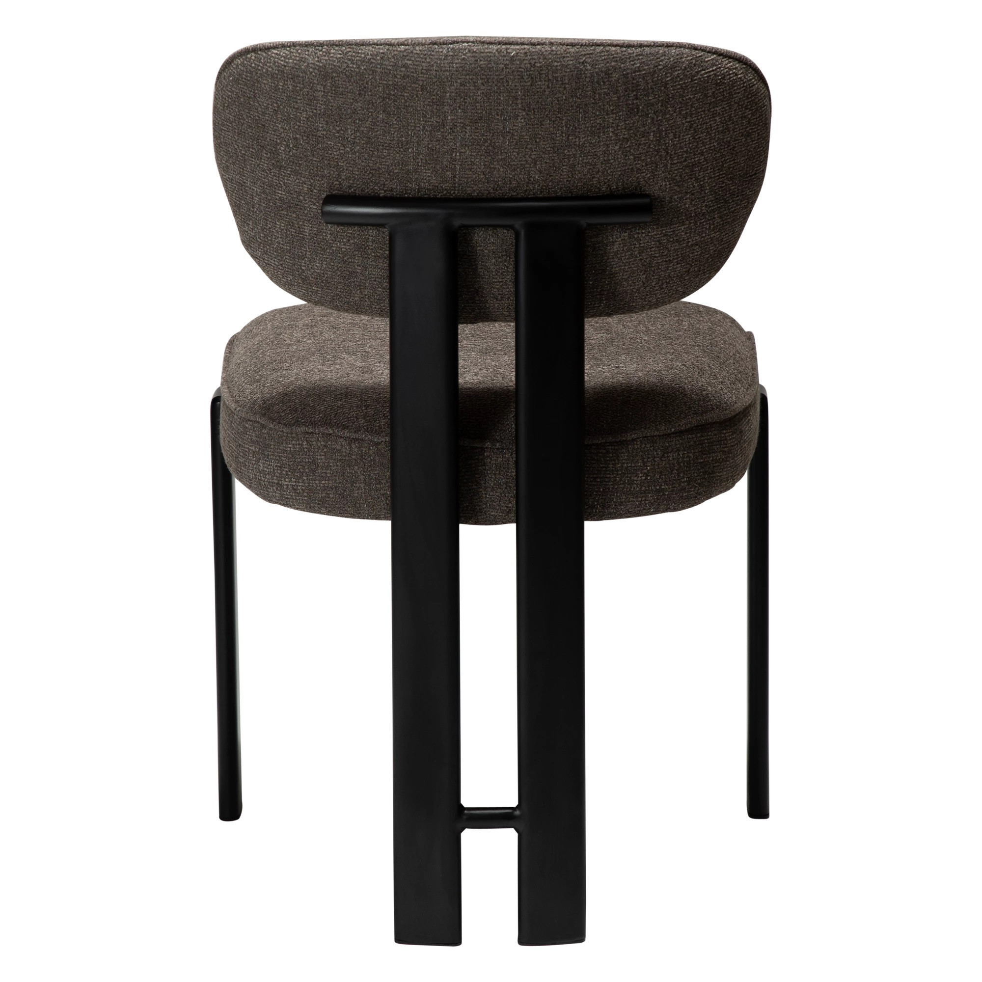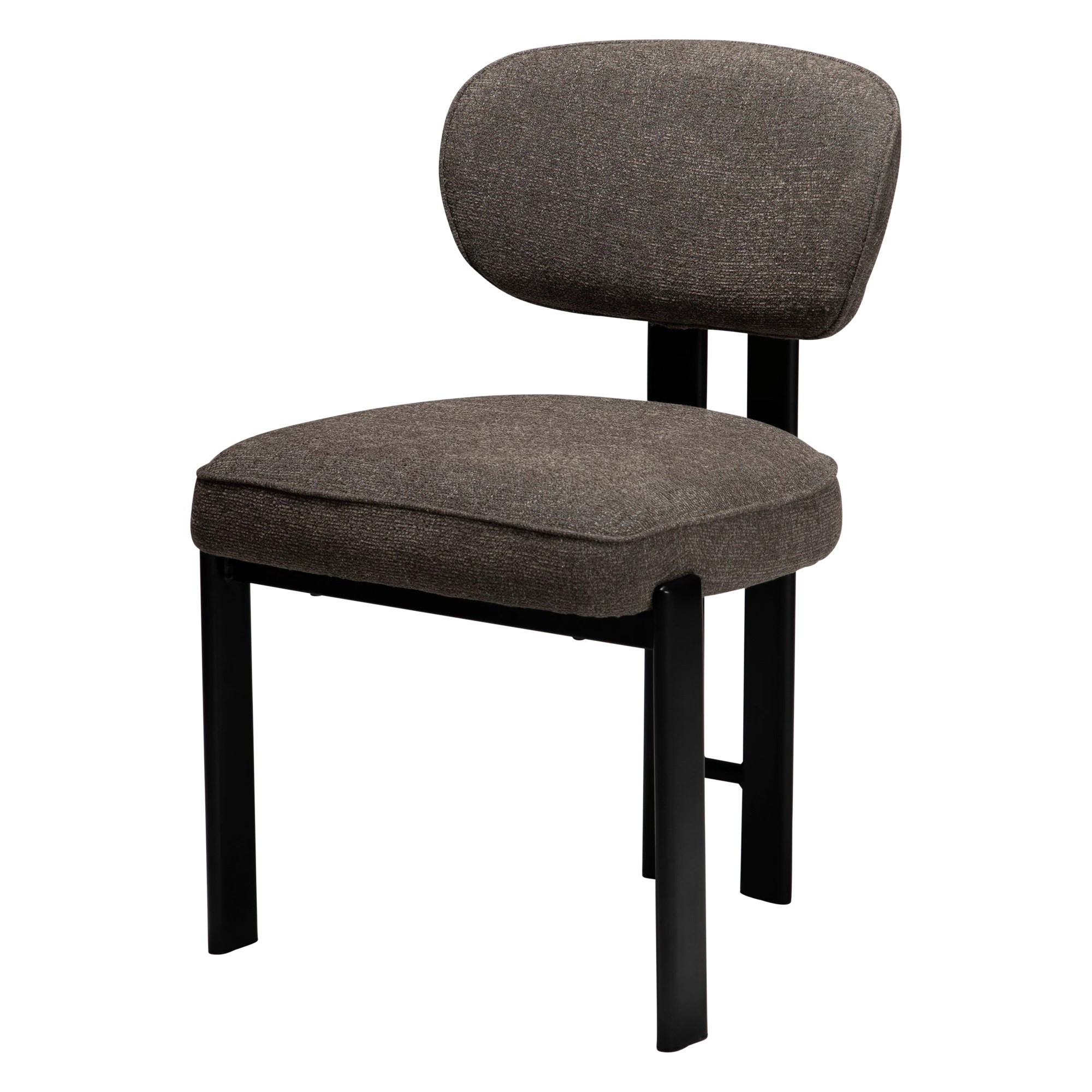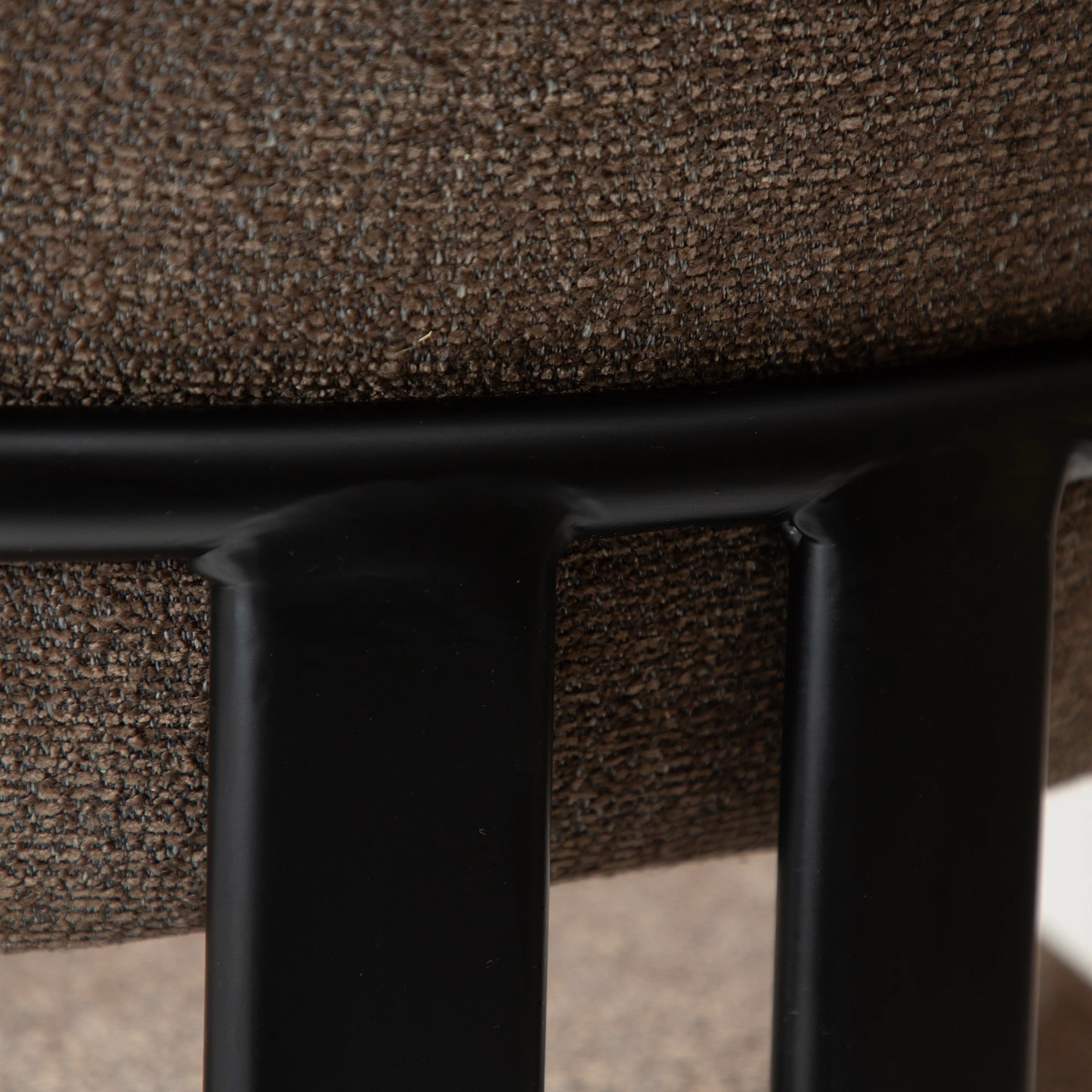 Siedzisko i oparcie wykonano z giętej sklejki, wypełnionej pianką, co zapewnia wygodę i stabilne podparcie. Tapicerka z tkaniny bouclé w kolorze Major Brown to głęboki, ciepły brąz o miękkiej, pętelkowej strukturze, który nadaje meblowi elegancki i przytulny charakter. Całość osadzona jest na czarnych, metalowych nogach malowanych proszkowo, które wprowadzają nowoczesny kontrast i podkreślają lekkość konstrukcji.