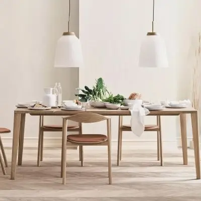 Stół Graceful występuje w kilku rozmiarach blatu do wyboru i w trzech wykończeniach drewna: dąb olejowany, dąb bielony i dąb bejcowany na czarno.