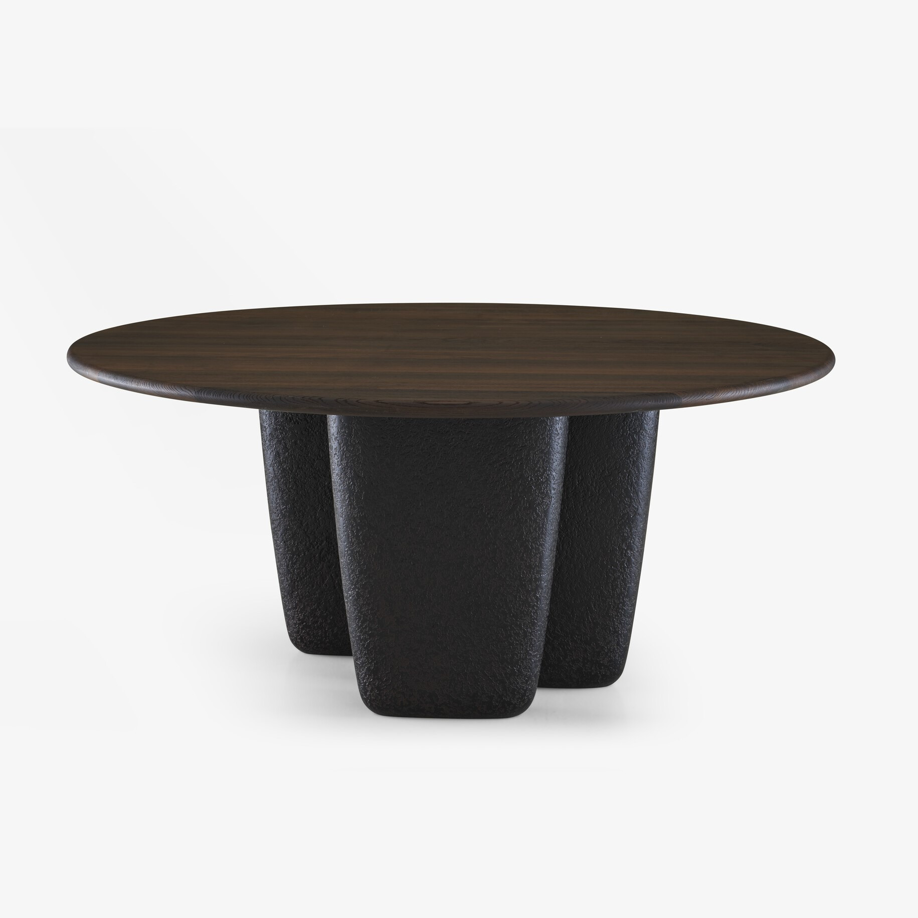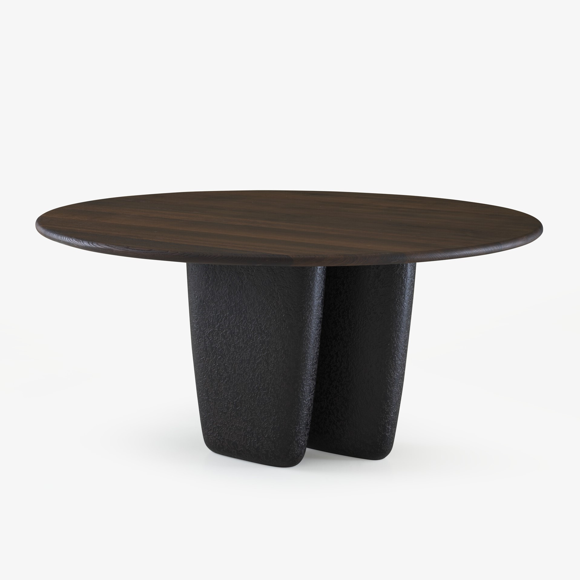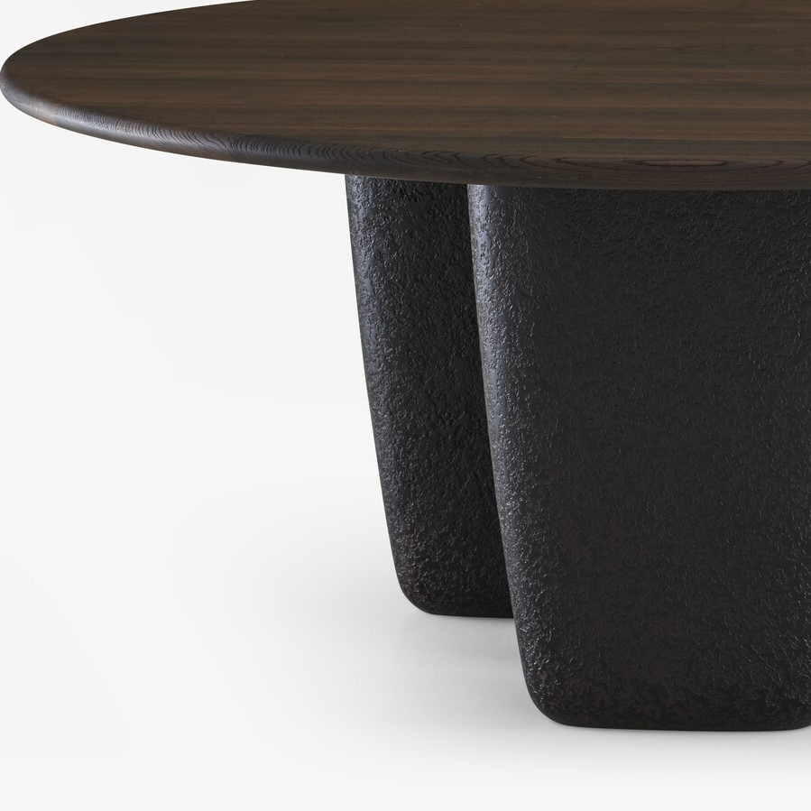 Trzy masywne, teksturyzowane nogi z żywicy w kolorze ciemnego brązu, ustawione w przesunięciu dla stabilności i estetyki, nadają stołowi wyrazistego, nowoczesnego charakteru i wprowadzają subtelny, rzeźbiarski akcent. Metalowe płyty montażowe gwarantują trwałość i pewność konstrukcji, a wykończenie szczotkowane podkreśla unikatową strukturę drewna, tworząc przyjemną w dotyku powierzchnię.