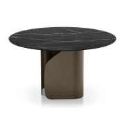 Twins to nowoczesny stół do jadalni, który robi mocne wrażenie wizualne dzięki swojej podstawie, która składa się z dwóch zakrzywionych elementów arkuszowych, które niczym dwa skrzydła optycznie zwiększają wysokość blatu. Blat stołu jest okrągły o średnicy 140 cm, wykonany z połączenia ceramiki i szkała (materiał stylizowany na marmur).