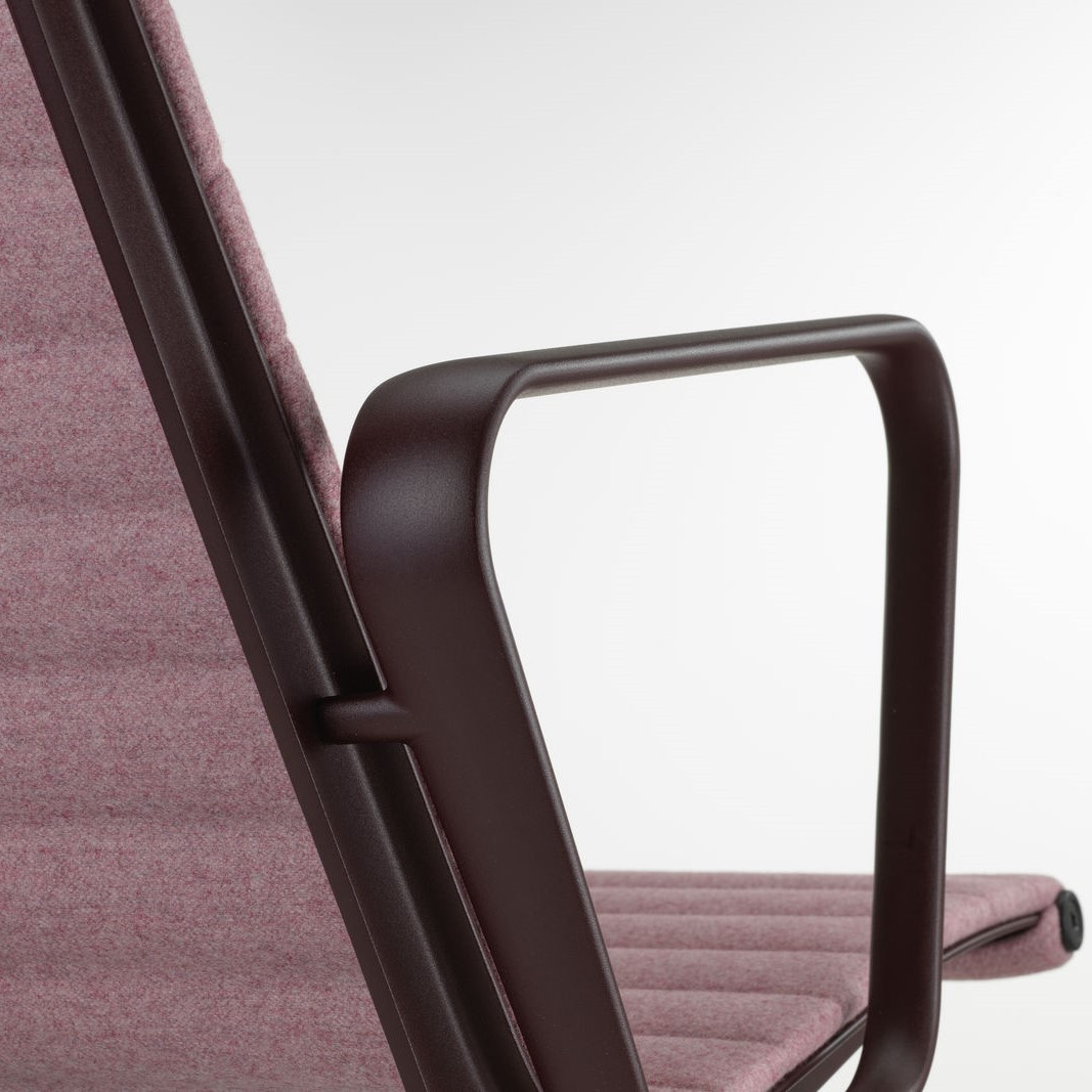 EA 124 z kolekcji Aluminium Group marki Vitra to esencja komfortu i ponadczasowej elegancji. Smukła sylwetka, wysokie oparcie i zintegrowany zagłówek perfekcyjnie dopasowują się do ciała, zapewniając wyjątkowy komfort nawet bez dodatkowych poduszek. Konstrukcja z napinanego materiału między profilami z odlewanego aluminium nadaje fotelowi lekkość, elastyczność i nowoczesny charakter. Wersja tapicerowana tkaniną Cosy 2 Pale Rose 16 z bazą w kolorze Dark Bordeaux to idealny wybór do domowego biura, salonu czy wnętrz publicznych – każdy, kto szuka nowoczesnego fotela, doceni połączenie luksusu i funkcjonalności.