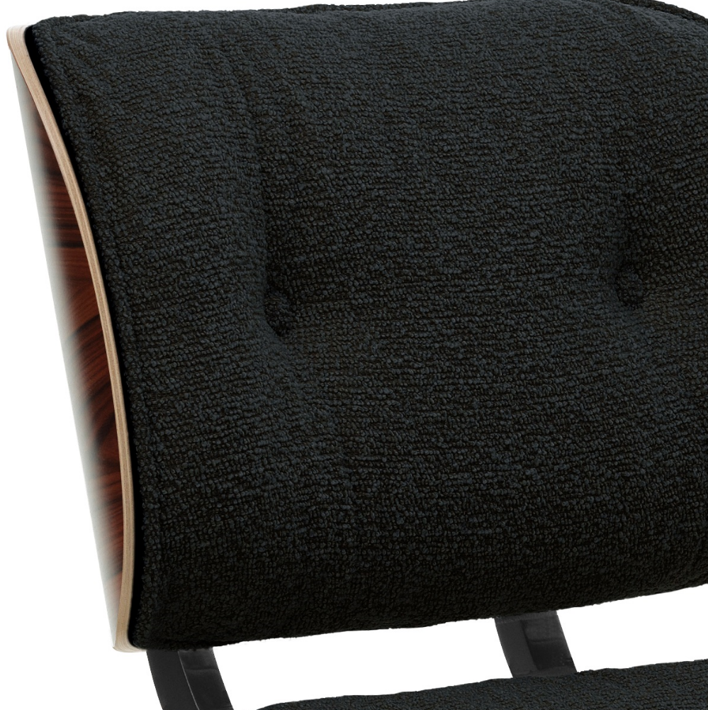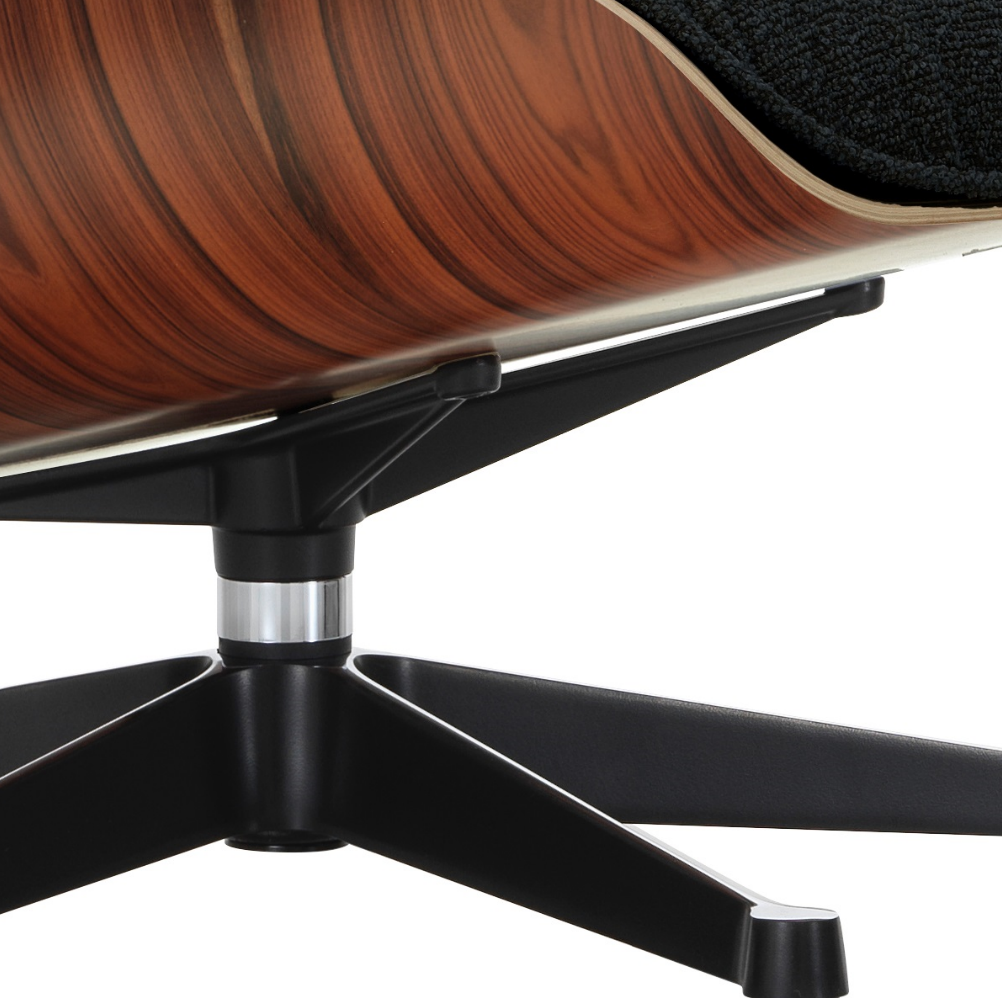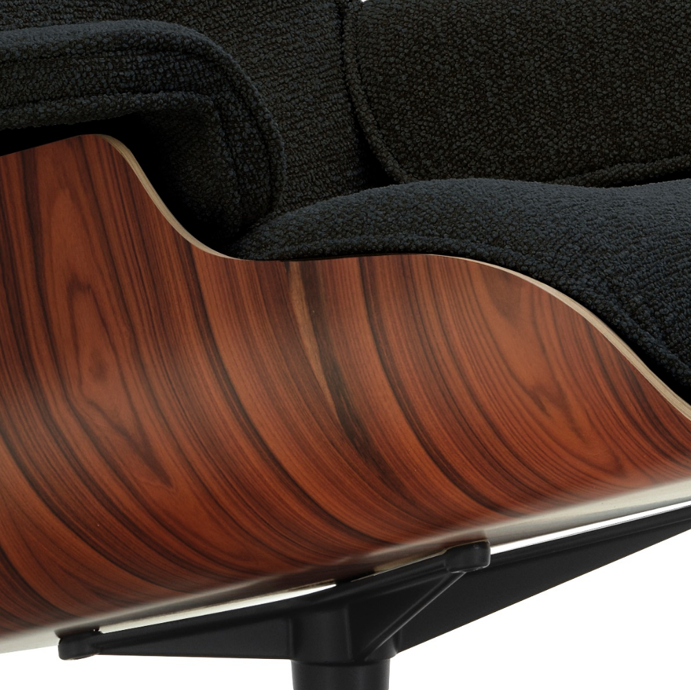 Fotel Eames Lounge Chair to bestseller, który łączy komfort, elegancję i ponadczasowy design. Tapicerowany tkaniną Nubia 11 Anthracite Black w jednolitym, antracytowo-czarnym odcieniu. Skorupa wykonana jest z drewna Santos Palisander wykończonego lakierem wodnym, a czarna podstawa w lakierze proszkowym nadaje fotelowi nowoczesny charakter.