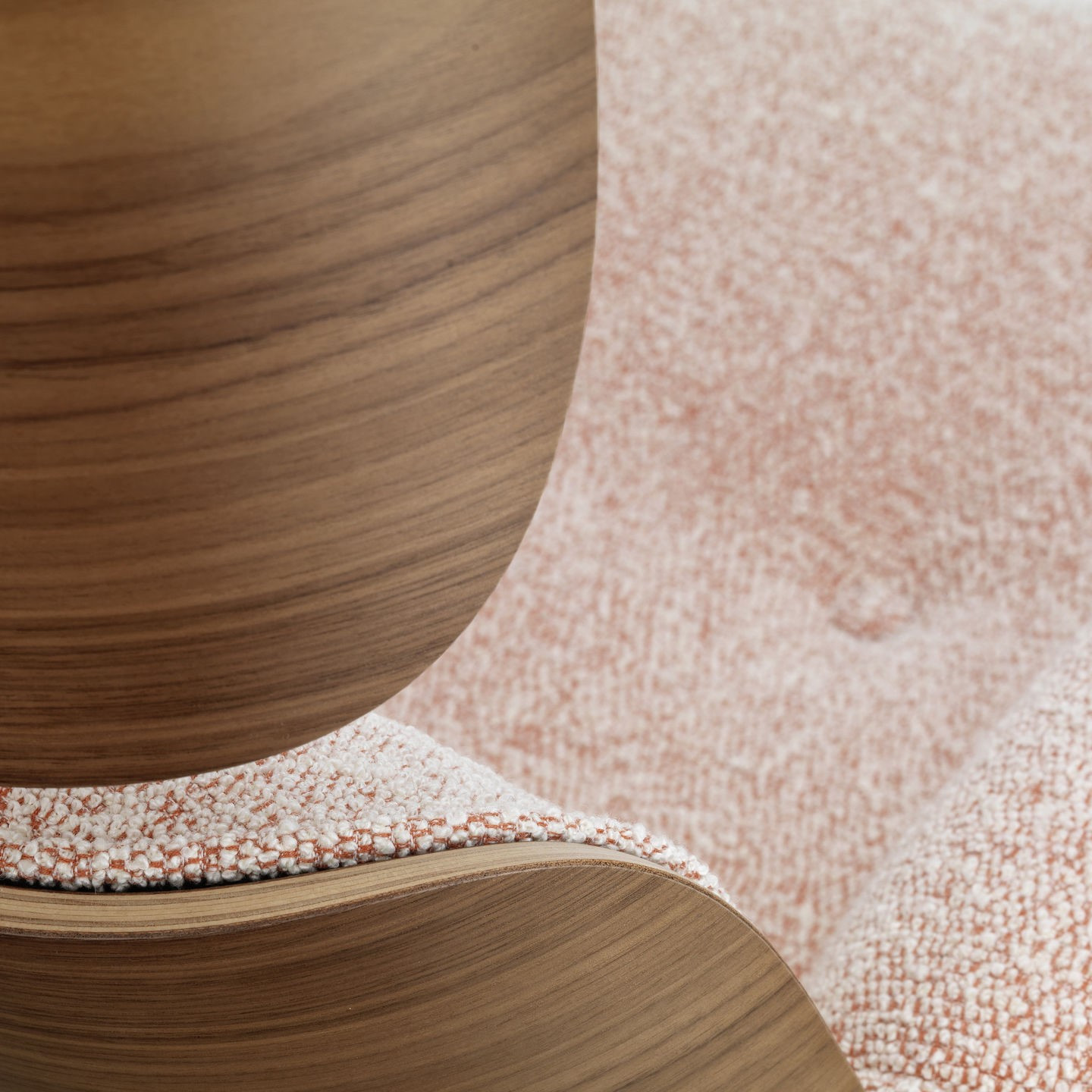 Fotel Eames Lounge Chair to bestseller, który łączy komfort, elegancję i ponadczasowy design. Tapicerowany tkaniną boucle Nubia Ivory Peacho subtelnym melanżu przędzy w odcieniach różu worzy efekt „pieprz i sól”. Skorupa wykonana jest z europejskiego orzecha wykończonego lakierem wodnym, a polerowana podstawa nadaje fotelowi bardzo nowoczesny charakter.