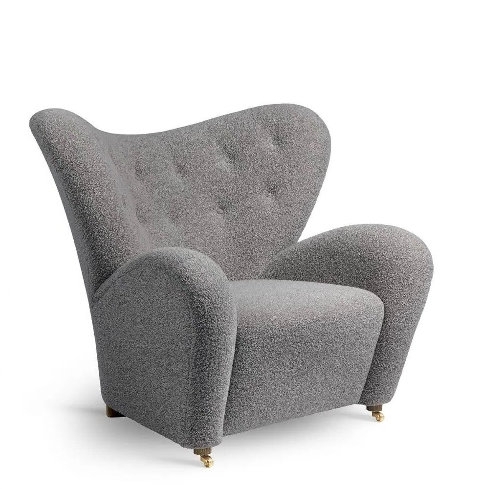 Wersja prezentowanego fotela posiada tapicerkę typu Boucle oraz nóżki dębowe w przydymionym kolorze. Do kompletu polecamy podnóżek z tej samej serii.