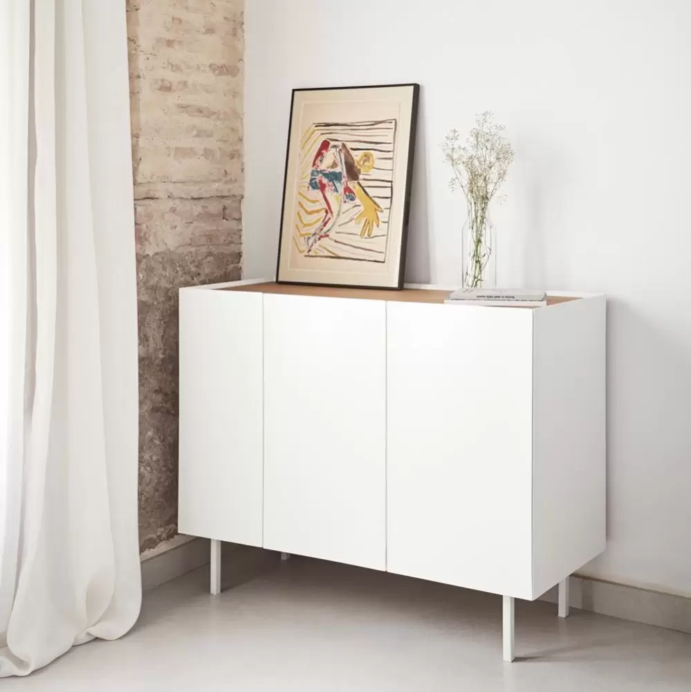 Nowoczesna komoda z serii Arista hiszpańskiej marki Teulat. Charakterystyczny element w postaci podwyższonej krawędzi, która łączy się z blatem pod kątem 45 stopni przez co swobodnie można otwierać drzwi pozbawionych uchwytów. Wykończone dębowym fornirem wnętrze komody wyposażone jest w system półek i 3 szuflady zapewniające wystarczającą przestrzeń do przechowywania najróżniejszych, domowych przedmiotów.
