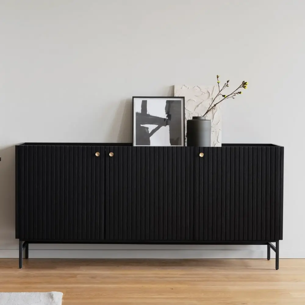 Dzięki swej oszczędnej formie inspirowanej skandynawskim wzornictwem użytkowym komoda Porter świetnie zaaranżuje przestrzeń zarówno tą jadalnianą jak i salonową. Komoda wykonana została z lakierowanego na czarno, dębowego forniru. Dekoracyjne, frezowane fronty drzwiczek w formie charakterystycznych rowków.