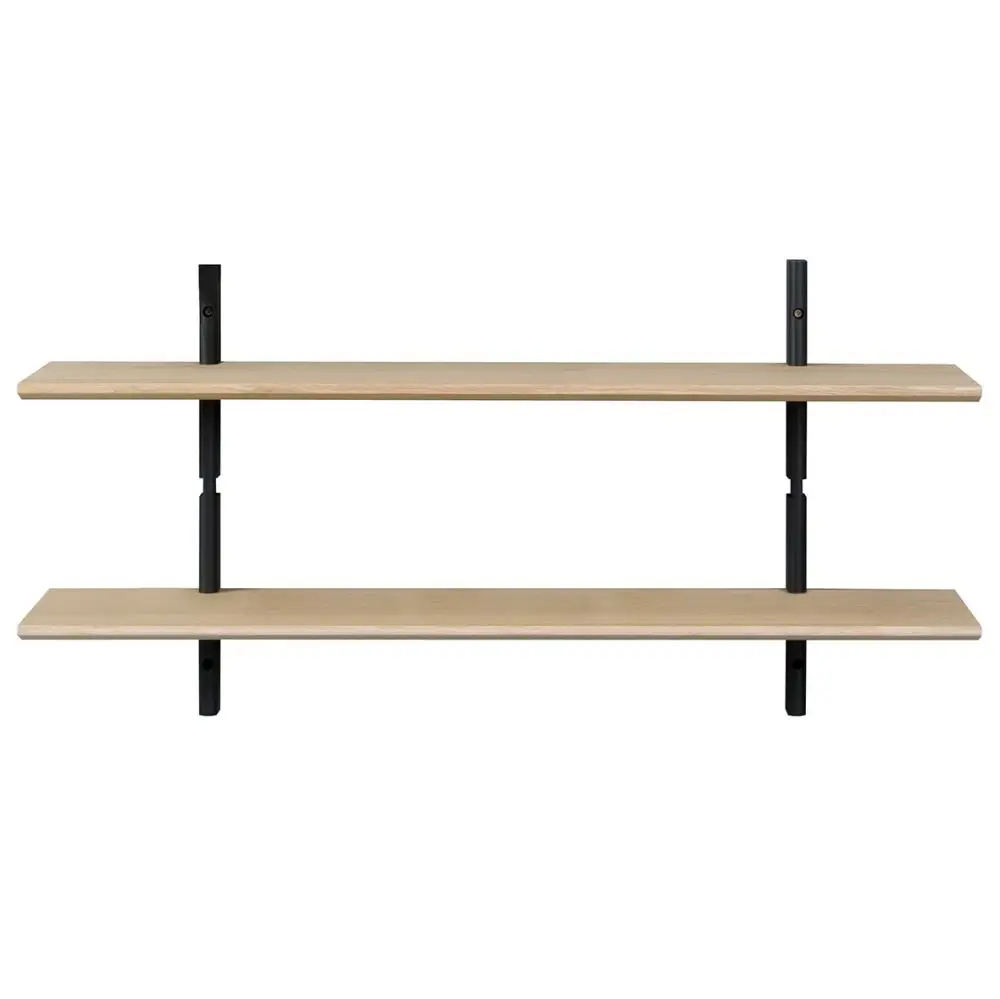 Prezentowany układ składa się z 2 półek o długości 96 cm oraz 2 słupków montowanych bezpośrednio do ściany. Półki wykonane zostały z jasnego dębu natomiast dla kontrastu słupki wykończono czarną bejcą.