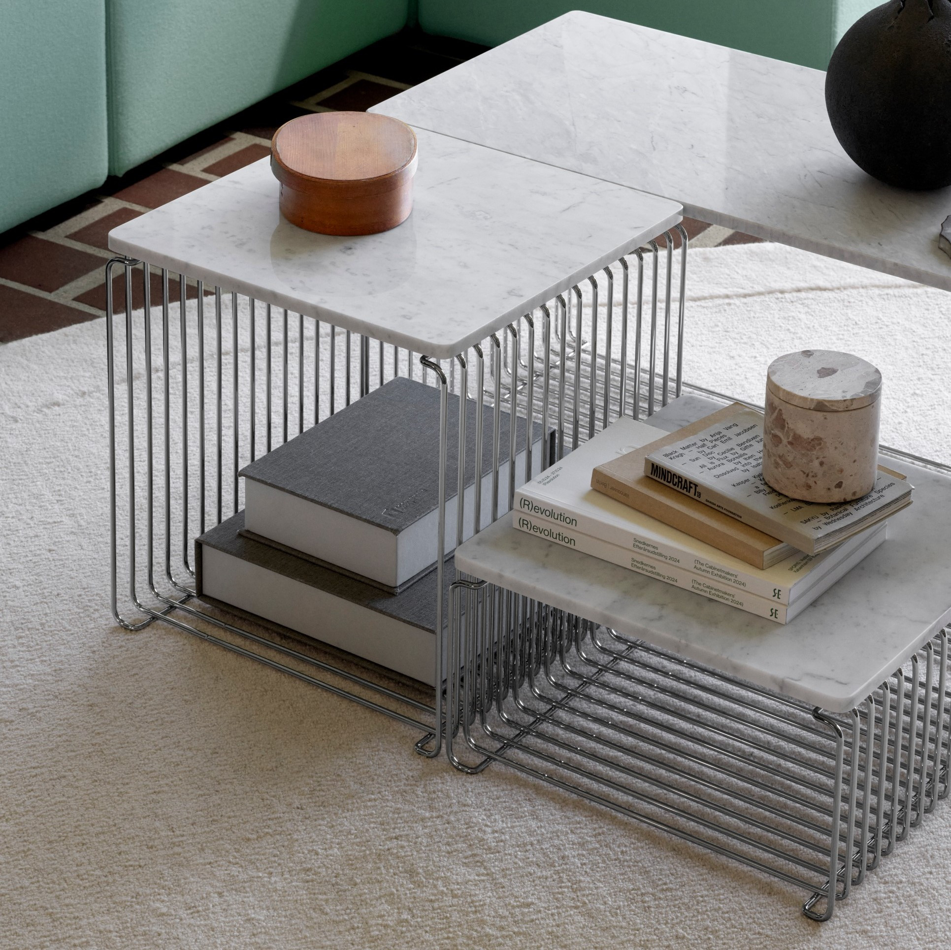 Prezentowany układ 2 modułów Panton Wire Single w rozmiarze 34,8 × 34,8 × 34,8 cm każdy to kompaktowa, pionowa kompozycja systemu, idealna jako np; półka na książki czy dokumenty czy minimalistyczna ekspozycja w sklepie. Ażurowa, druciana konstrukcja nadaje bryle architektoniczny charakter i sprawia, że nawet rozbudowana zabudowa pozostaje lekka optycznie.