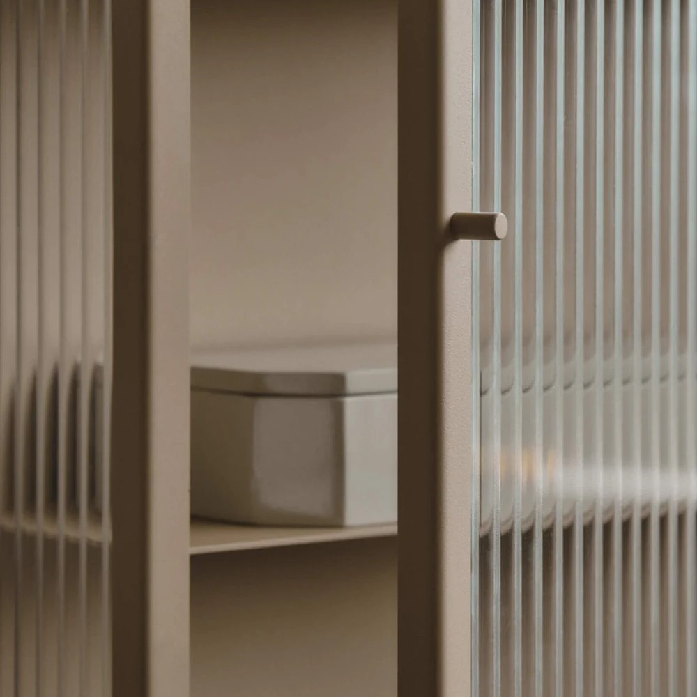 Minimalistyczna szafka ścienna z kolekcji Haze duńskiej marki Ferm Living. Połączenie funkcjonalności, elegancji i ponadczasowego wzornictwa. Wykonana z malowanego proszkowo żelaza i ryflowanego szkła, łączy lekkość formy z trwałą konstrukcją. Przemysłowy, a zarazem subtelny design w klasycznej czerni wprowadza do wnętrza wyjątkowy, rustykalny charakter. Szklane fronty delikatnie zacierają zawartość, zachowując poczucie porządku i estetyki.