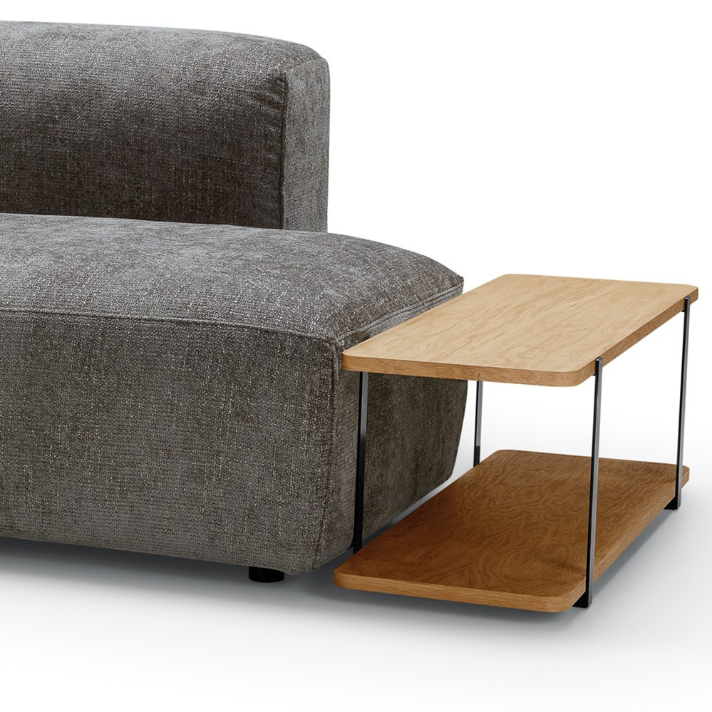 Edda to sofa modułowa z praktycznym stolikiem kawowym, zaprojektowana z myślą o nowoczesnych wnętrzach, w których liczy się elastyczność i wygoda. Układ ze stolikiem o wymiarach 104 × 31 cm w wybarwieniu dębowym tworzy funkcjonalną strefę wypoczynku, łącząc miejsce do siedzenia i funkcjonalny punkt na książki, czasopisma czy kubek z kawą. Sofę wykończono tkaniną Bloom w kolorze zieleni – miękką, strukturalną i przyjemną w dotyku, która nadaje całości ciepły, przytulny charakter. Zdejmowane poszycia mocowane na rzepy ułatwiają pielęgnację i pozwalają odświeżać wygląd mebla.