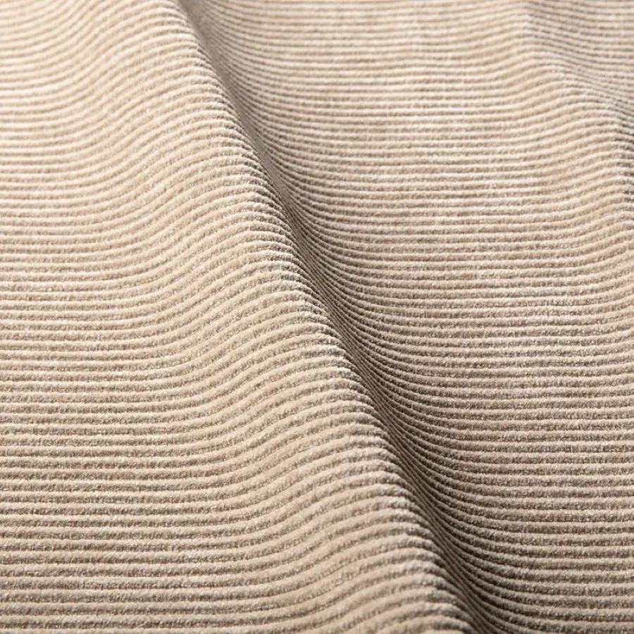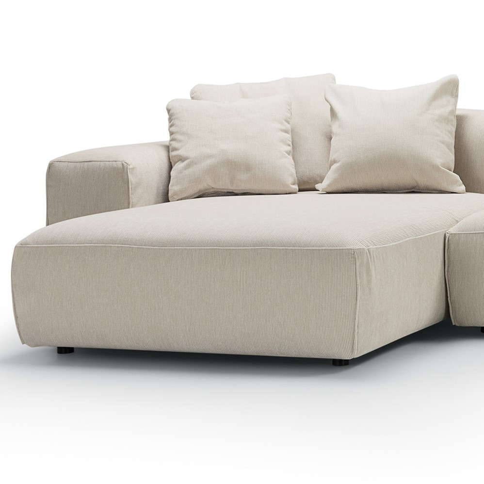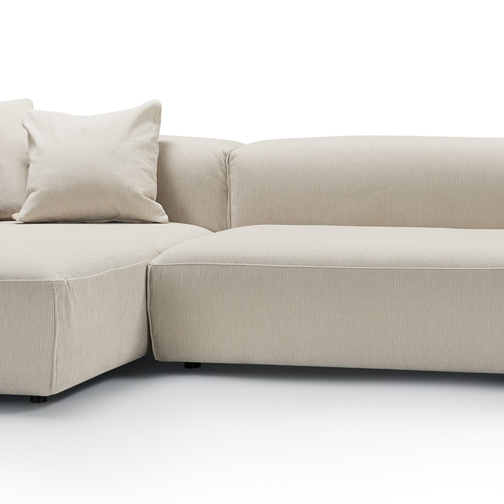 Sofa została wykończona tkaniną Moss natural w przyjemnym odcieniu beżu - modnym sztruksie, który urzeka przepięknymi ziemistymi odcieniami rodem ze Skandynawii. Zdejmowane poszycia mocowane na rzepy ułatwiają pielęgnację i pozwalają szybko odświeżyć wygląd mebla.