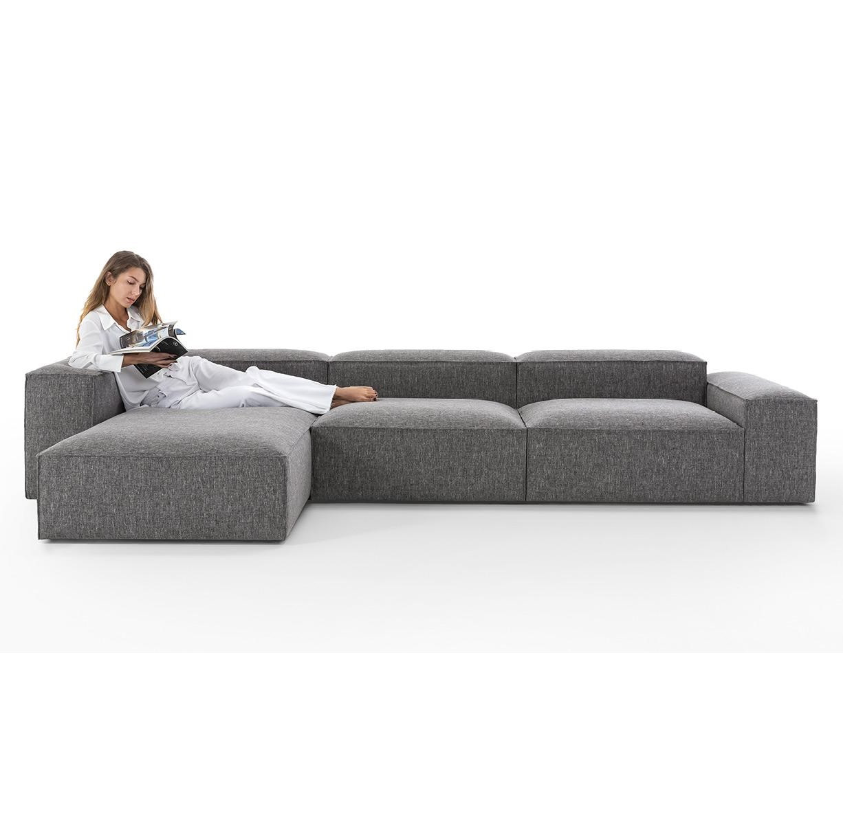 Reverso marki Felis – modułowa, włoska sofa dająca pełną swobodę aranżacji. Każdy element – siedzisko, oparcie czy podłokietnik – można łączyć dowolnie, tworząc układy liniowe, narożne, wyspy relaksu lub nietypowe konfiguracje. Wybieraj różne rozmiary elementów, kształty krawędzi (gładkie lub zaokrąglone), wysokość i szerokość podłokietników, a także poduszki i tapicerki w tkaninie lub skórze, dopasowując sofę do wnętrza i nastroju.