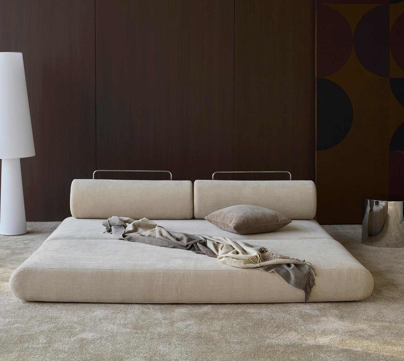 Sofa rozkładana Circlus marki Innovation Living to wyrafinowany design inspirowany stylem lat 70., w którym centralnym motywem jest geometria koła i miękka, rzeźbiarska forma. Ta nowoczesna sofa łączy funkcję sofy, strefy relaksu i wygodnego łóżka, oferując pełną elastyczność w codziennym użytkowaniu. Może pełnić rolę podwójnego łóżka lub dwóch osobnych miejsc do spania, co czyni ją wyjątkowo praktycznym rozwiązaniem do nowoczesnych wnętrz.