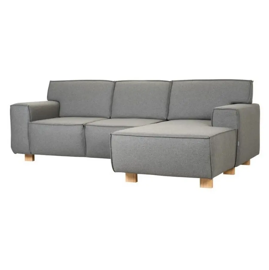 Sofa Trivento z funkcją spania występuje w 2 wariantach; z szezlongiem i bez przedłużenia. Wersja prezentowana posiada pojemnik na pościel pod szezlogiem zamieszczonym z prawej strony, sofa tapicerowana 1 z tkanin z gatunku Cortina (I gr. cenowa), nogi dębowe.