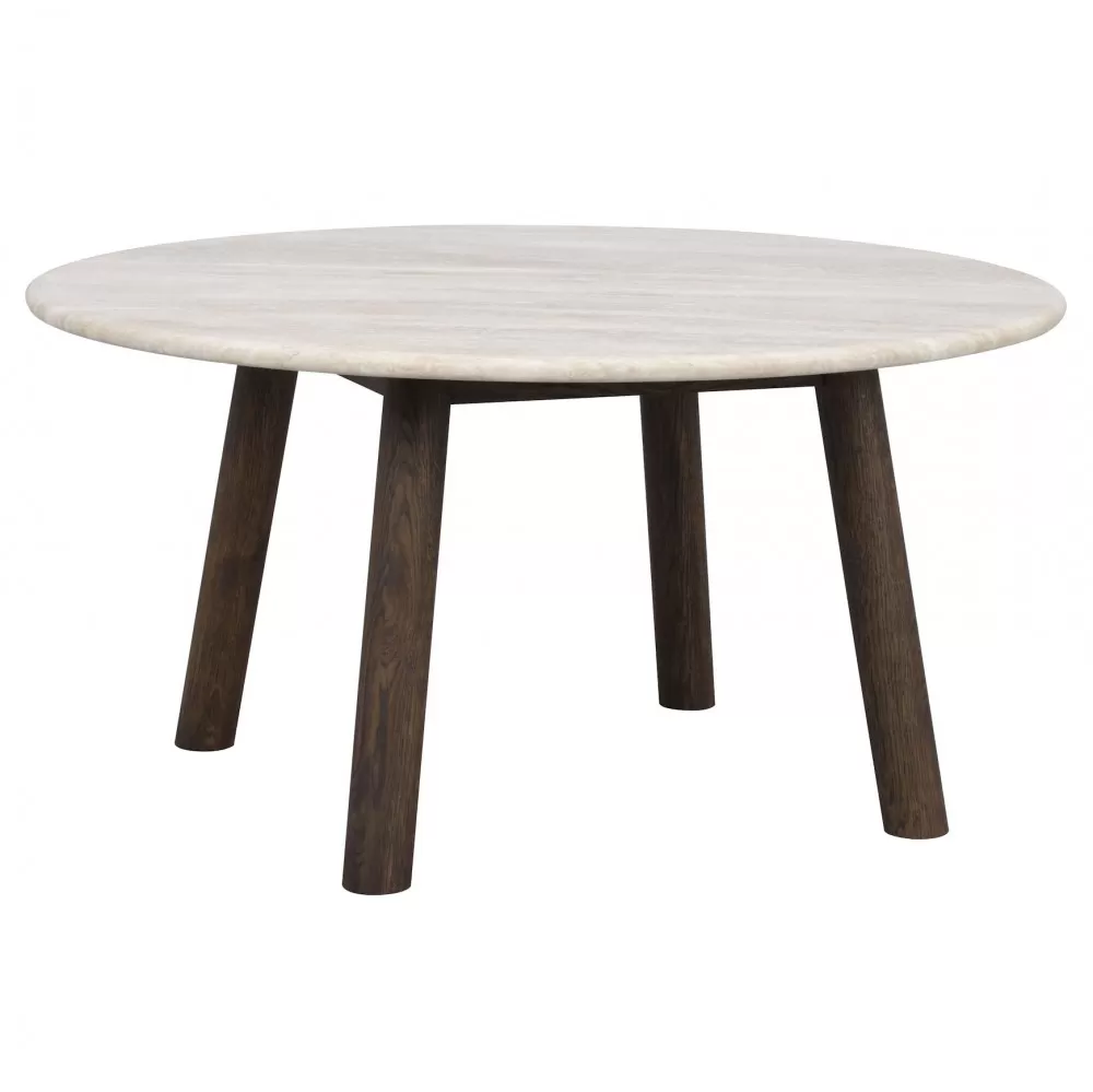 Stolik kawowy Elba posiada kamienny blat wykonany z włoskiego trawertynu oraz solidne nogi z brązowego dębu z certyfikatem FSC. Trawertyn to rodzaj wapienia o żywej fakturze, która nadaje stołowi naturalne piękno, a z czasem niepowtarzalną patynę (należy pamiętać, że trawertyn jest materiałem naturalnym i dlatego mogą wystąpić różnice w fakturze i kolorze. Małe ubytki nie są wadą, ale unikalną cechą każdego stołu).