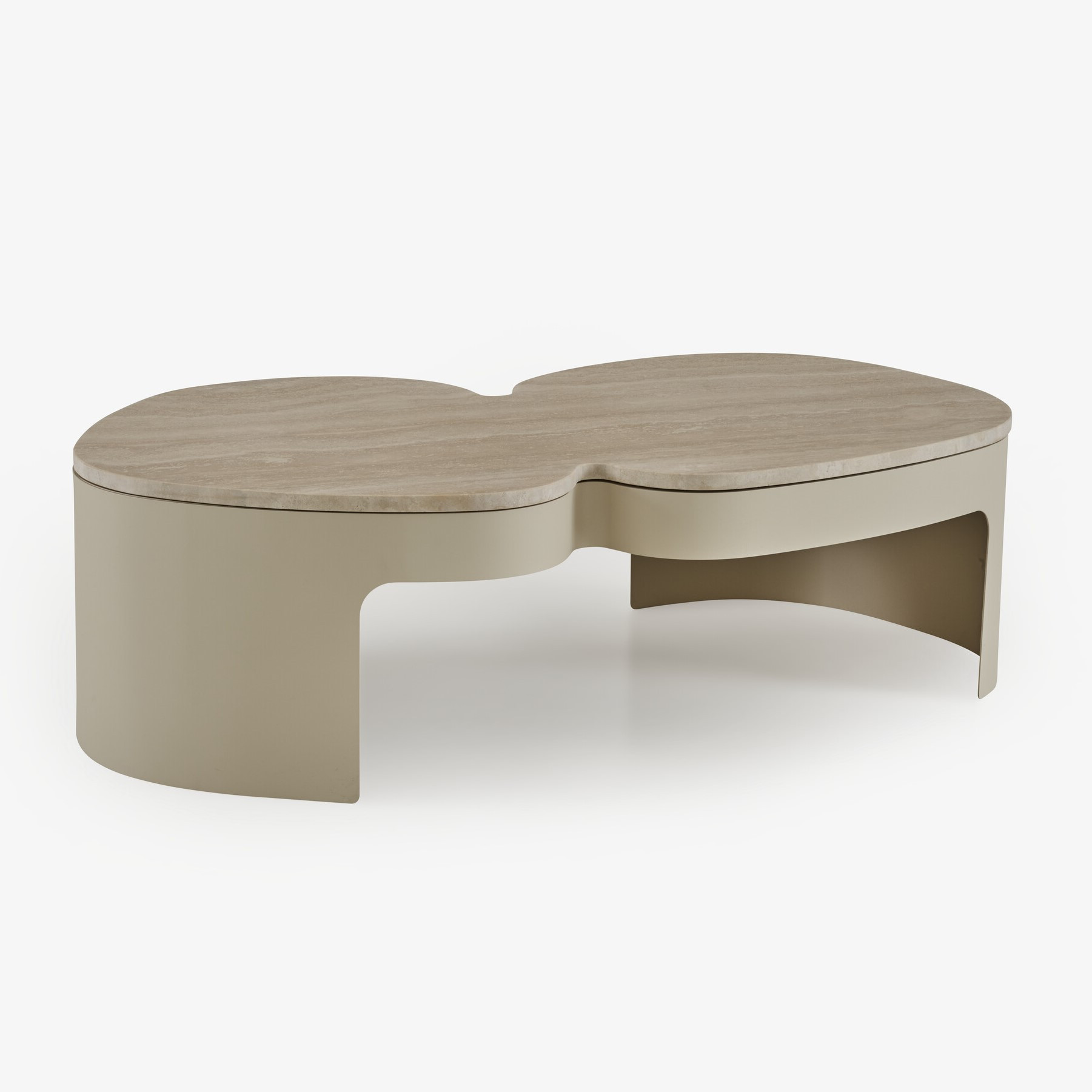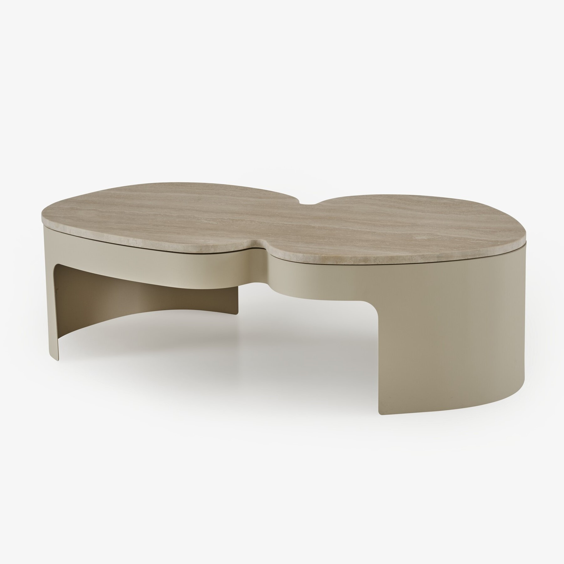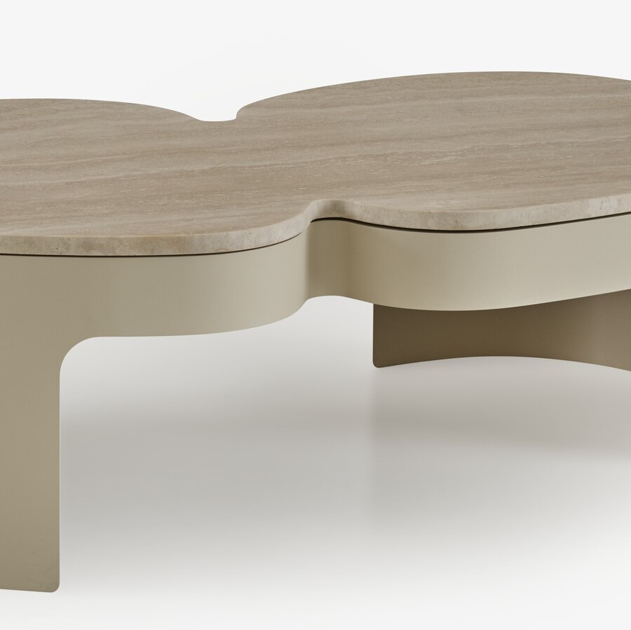 Model z blatem z naturalnego kamienia Trawertyn wyróżnia się ciepłą, beżowo-piaskową tonacją z delikatnymi żyłkami charakterystycznymi dla trawertynu, nadając stolikowi luksusowy charakter. Stalowa, beżowo lakierowana podstawa łączy stabilność z lekkością formy, a starannie dopracowane detale akcentują współczesny, designerski charakter mebla.
