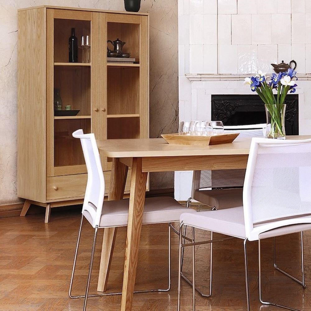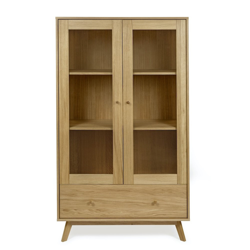 Witryna Kensal marki Woodman ączy ponadczasowy design z funkcjonalnością. Klasyczna forma z przeszklonymi drzwiami z hartowanego szkła pozwala pięknie wyeksponować porcelanę, książki czy dekoracje. Korpus i fronty wykonano z dębowego forniru, a solidna podstawa z fornirowanej sklejki i litego dębu gwarantuje trwałość. Drzwi w ramie z MDF, szuflada na metalowych prowadnicach oraz dwa pojemne poziomy wnętrza zapewniają wygodne przechowywanie.