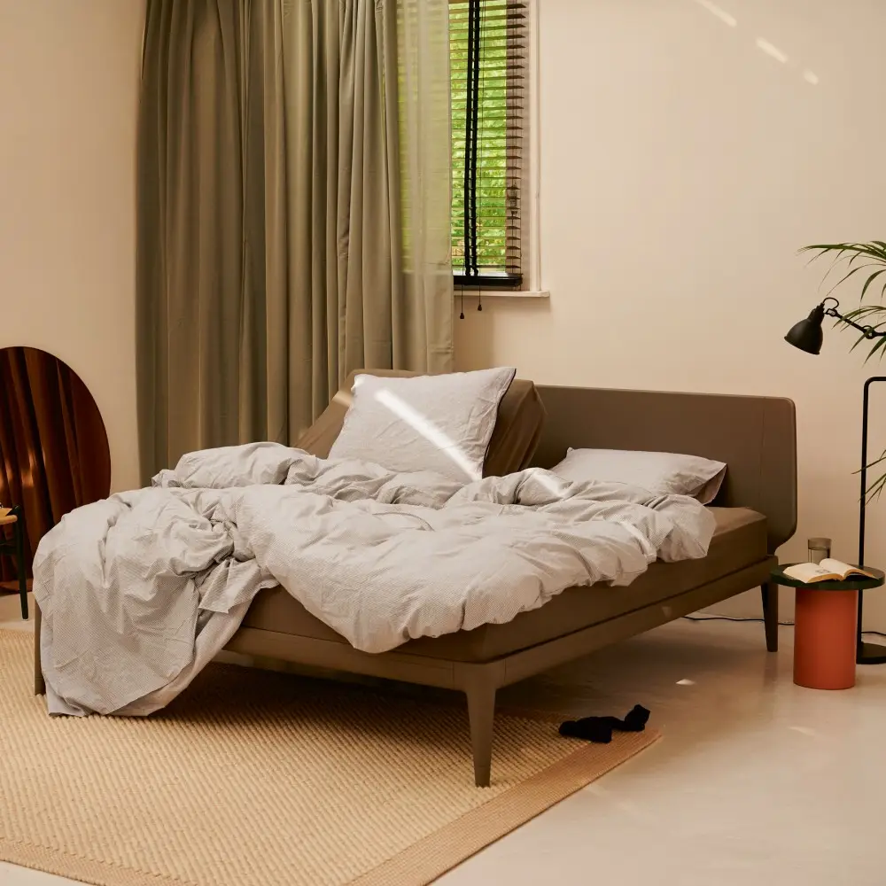 Łóżko Essential wyróżnia się prostymi, subtelnymi liniami i nowoczesnym wyglądem, który doskonale komponuje się z różnymi stylami wnętrz. Łóżko opiera się na aluminiowej ramie, a miękki, okrągły kształt wezgłowia zapewnia poczucie bezpieczeństwa i komfortu. Wybierz jeden spośród pięciu stelaży, które pozwolą Ci na różny stopień regulacji.