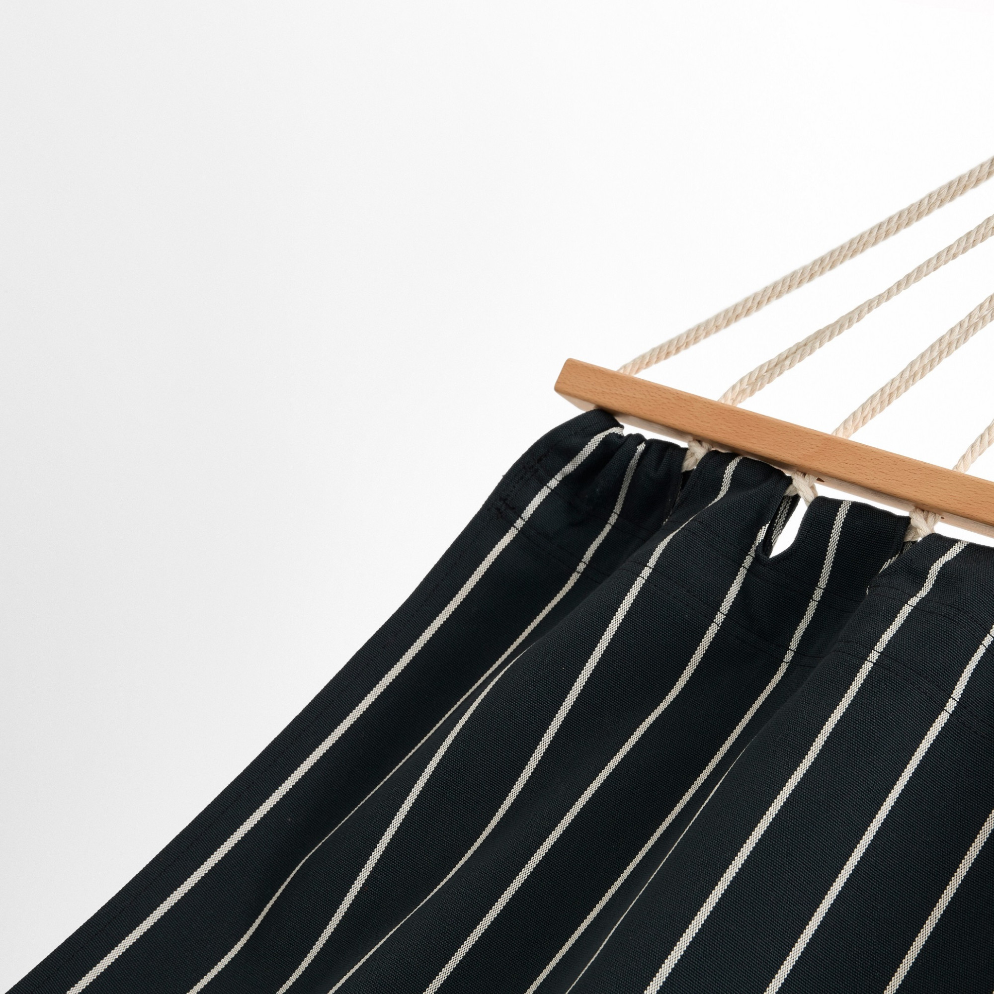 Dzięki solidnym zakończeniom z drewna bukowego oraz mocowaniom na linach, hamak jest łatwy w montażu i pozwala na szybkie zawieszenie w dowolnej przestrzeni. Lekka, a jednocześnie wytrzymała konstrukcja sprawia, że idealnie sprawdza się zarówno do odpoczynku, jak i krótkiej drzemki. Charakterystyczne czarne wykończenie z beżowym paskiem podkreśla estetykę marki HAY, łącząc funkcjonalność z nowoczesnym, skandynawskim stylem.