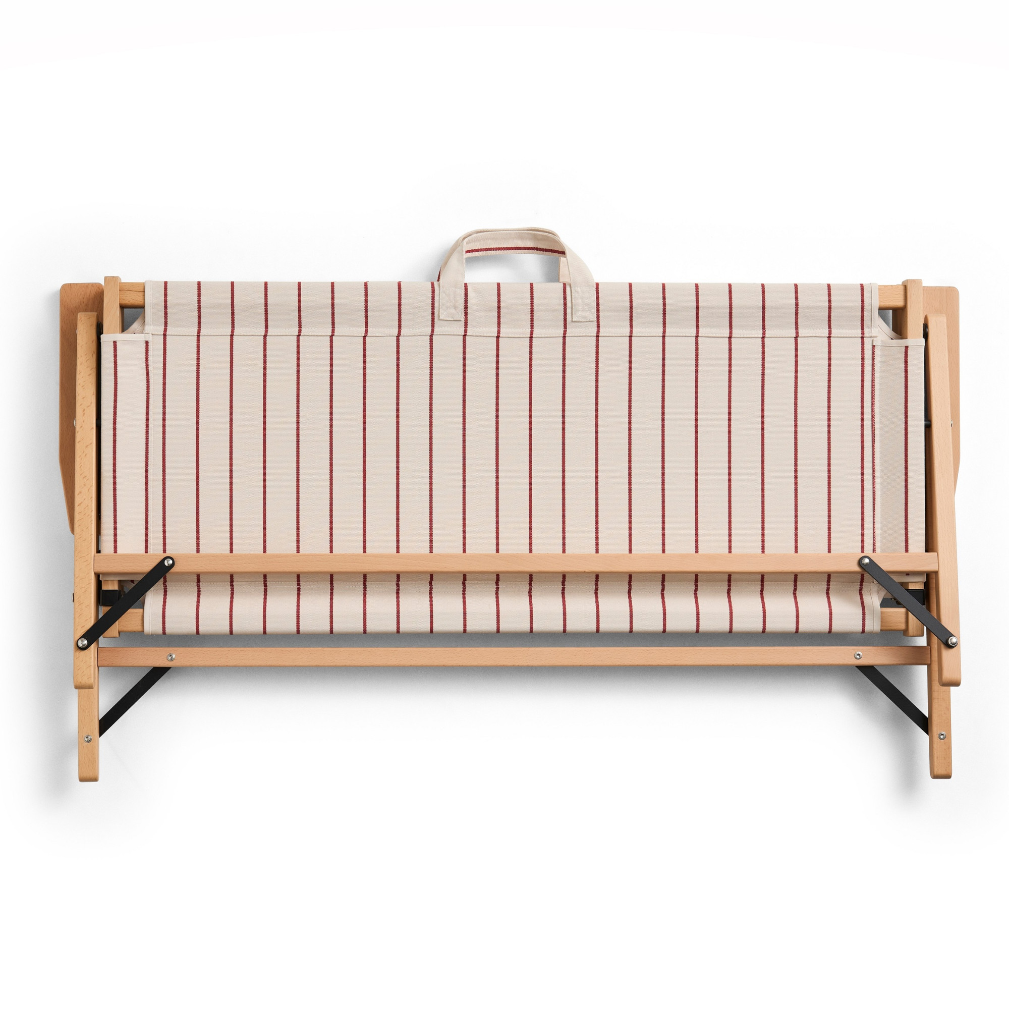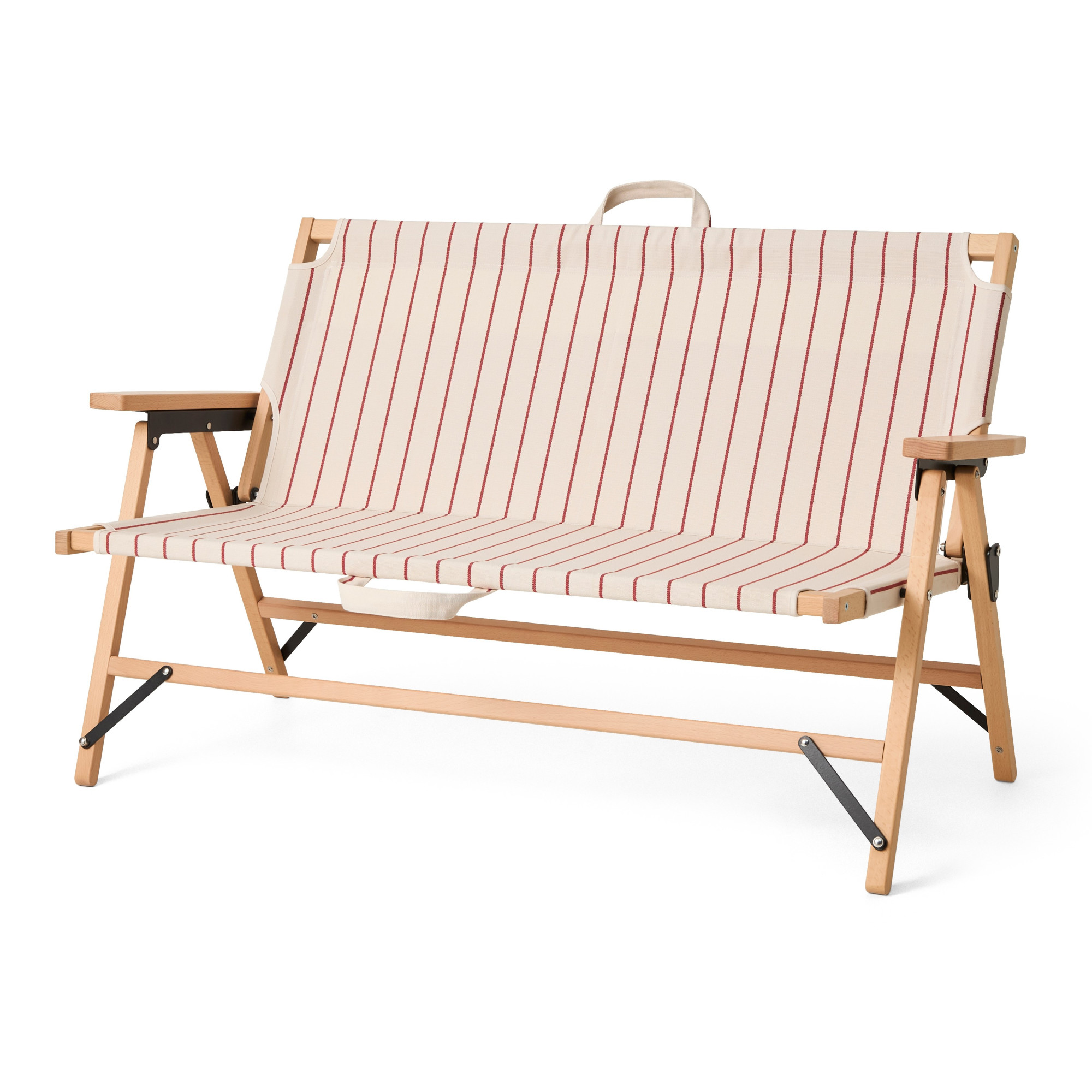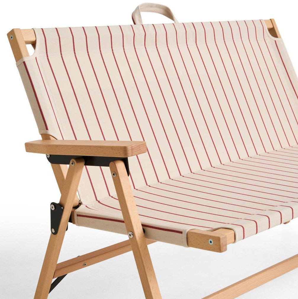 Sofa ogrodowa z kolekcji Outdoor Market duńskiej marki HAY. Lekka, mobilna i bardzo stylowa, zaprojektowana z myślą o swobodnym, nowoczesnym wypoczynku na świeżym powietrzu. Minimalistyczna konstrukcja łączy funkcjonalność z charakterystyczną dla HAY estetyką skandynawskiego designu. Stelaż wykonany z lekkiego drewna bukowego FSC™ 100% zapewnia stabilność przy zachowaniu niskiej wagi, a siedzisko z tkaniny z recyklingowanego poliestru w paskowanym wzorze nadaje całości współczesny, graficzny charakter.