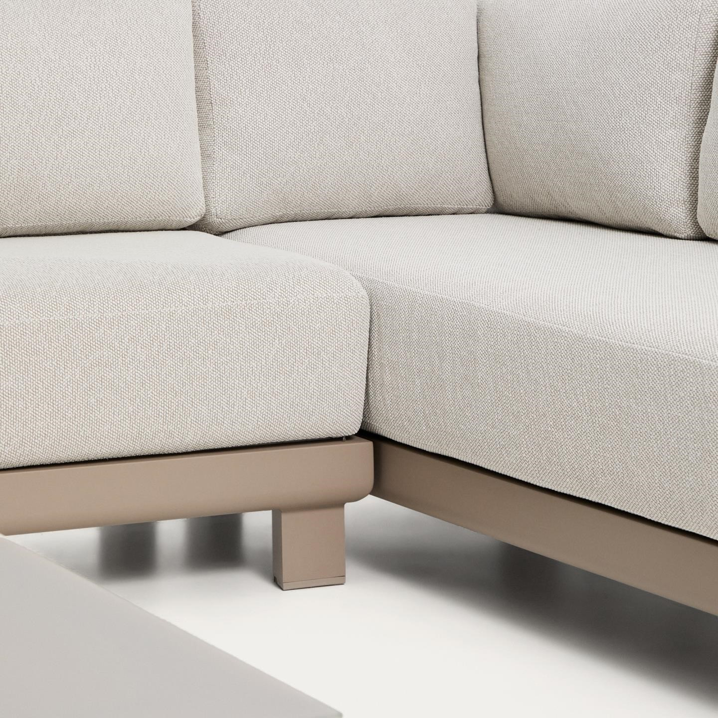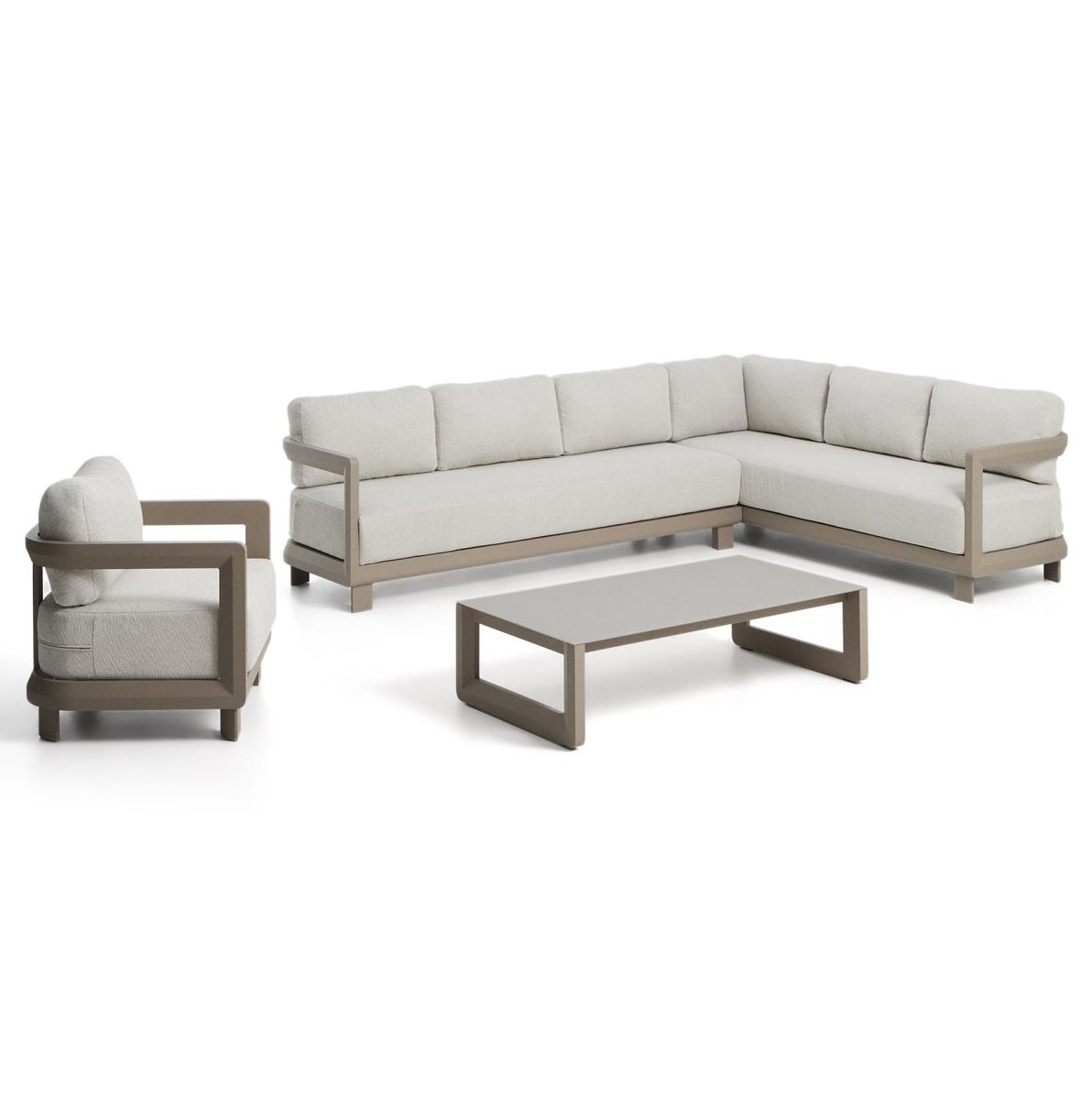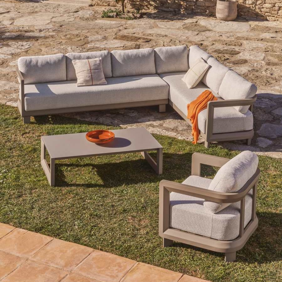 Zestaw ogrodowy Nerano to nowoczesna strefa wypoczynkowa zaprojektowana z myślą o komfortowym relaksie na tarasie, w ogrodzie lub przestrzeni komercyjnej. W skład kompletu wchodzi 5-osobowa sofa narożna, fotel oraz stolik kawowy z hartowanego szkła, tworząc spójną i funkcjonalną aranżację outdoorową. Konstrukcja oparta na lekkim aluminium malowanym proszkowo zapewnia wysoką odporność na rdzę, korozję oraz promieniowanie UV, co przekłada się na trwałość w zmiennych warunkach atmosferycznych.